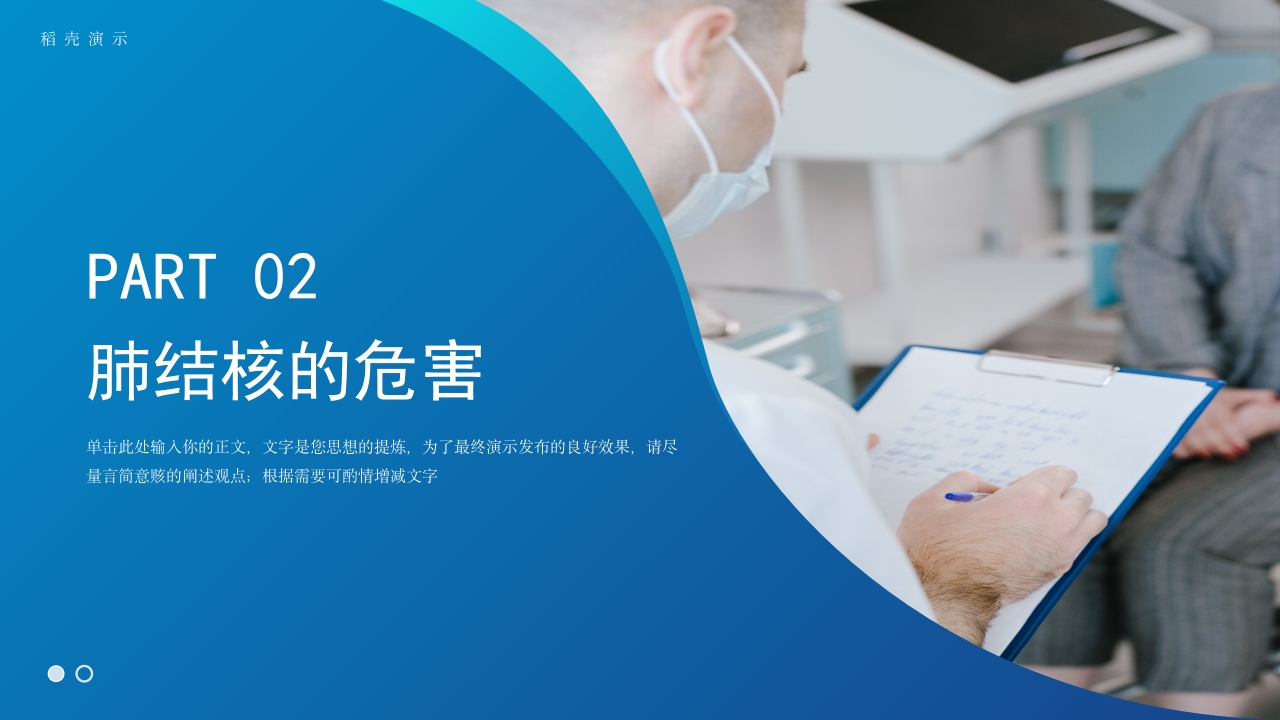 稻壳演示K不NOWLEDGE LECTURE肺结核防治知识讲座单击此处输入你的正文,文字是您思想的提炼,为了最终演示发布的良好效果,请尽量言简意赅的闸述观点;根据需要可酌情增减文字XXX●0