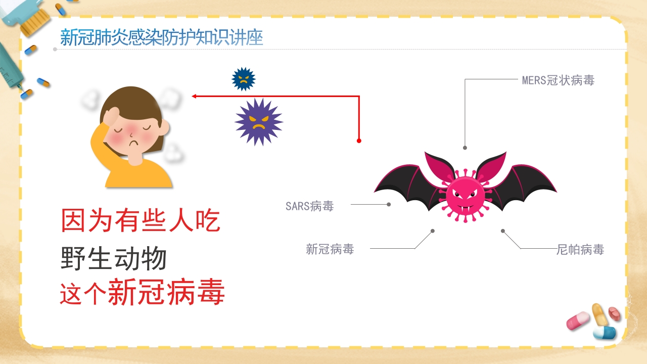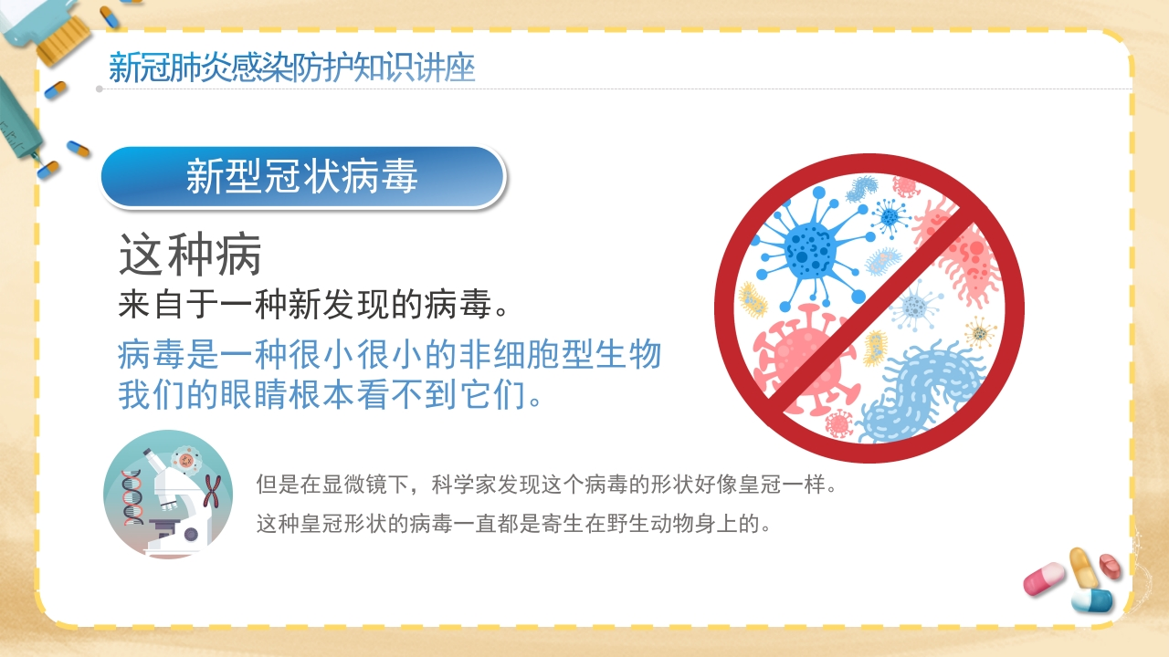 预防新冠肺談幼儿教育机构防护知识讲座勤洗手戴口罩拒野味常锻炼。主讲教师:XXX时间:XX年X月XX