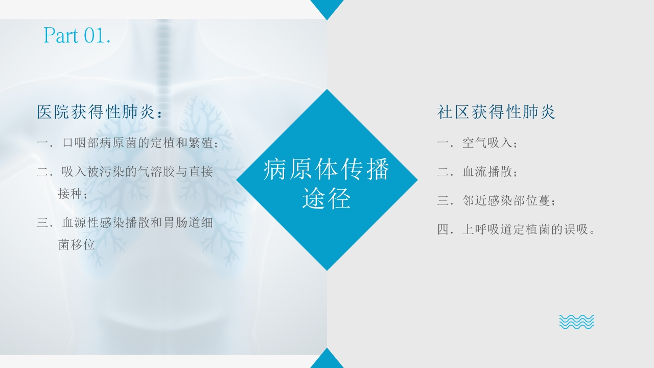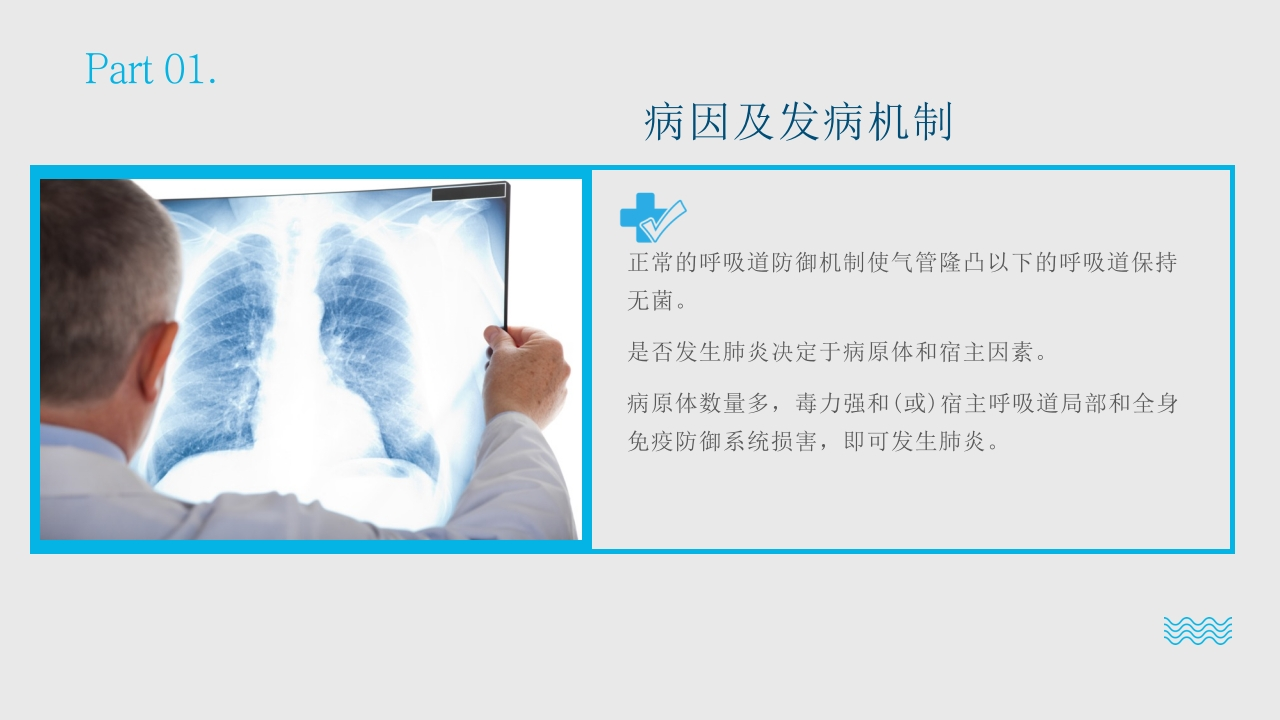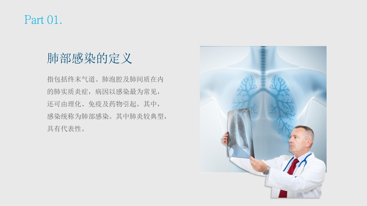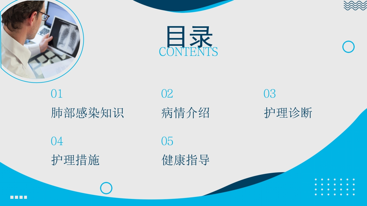 彩医疗护理知识培训PPT模板肺部感染护理查房PULMONARY I NFECTI ON NU RSING ROUNDS知识/介绍/诊断/措施/指导汇报人:Xxx时间:20XX.XX彩