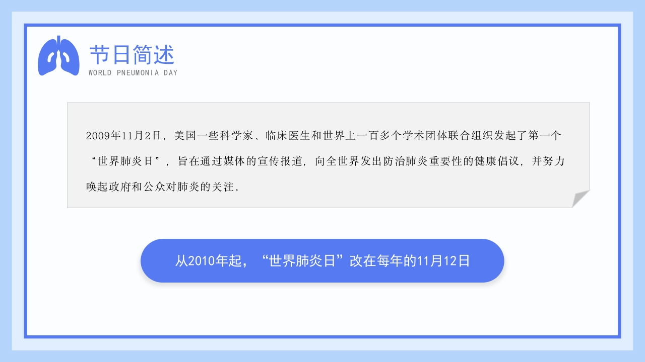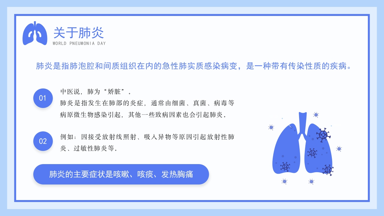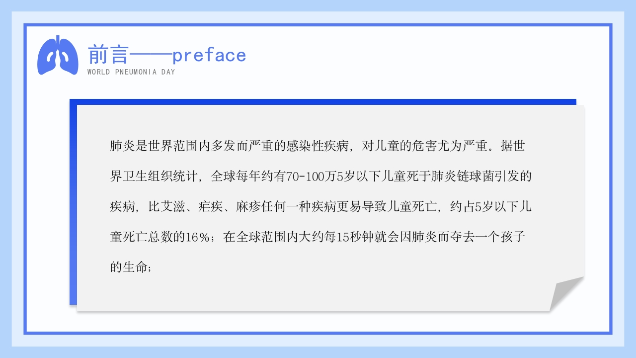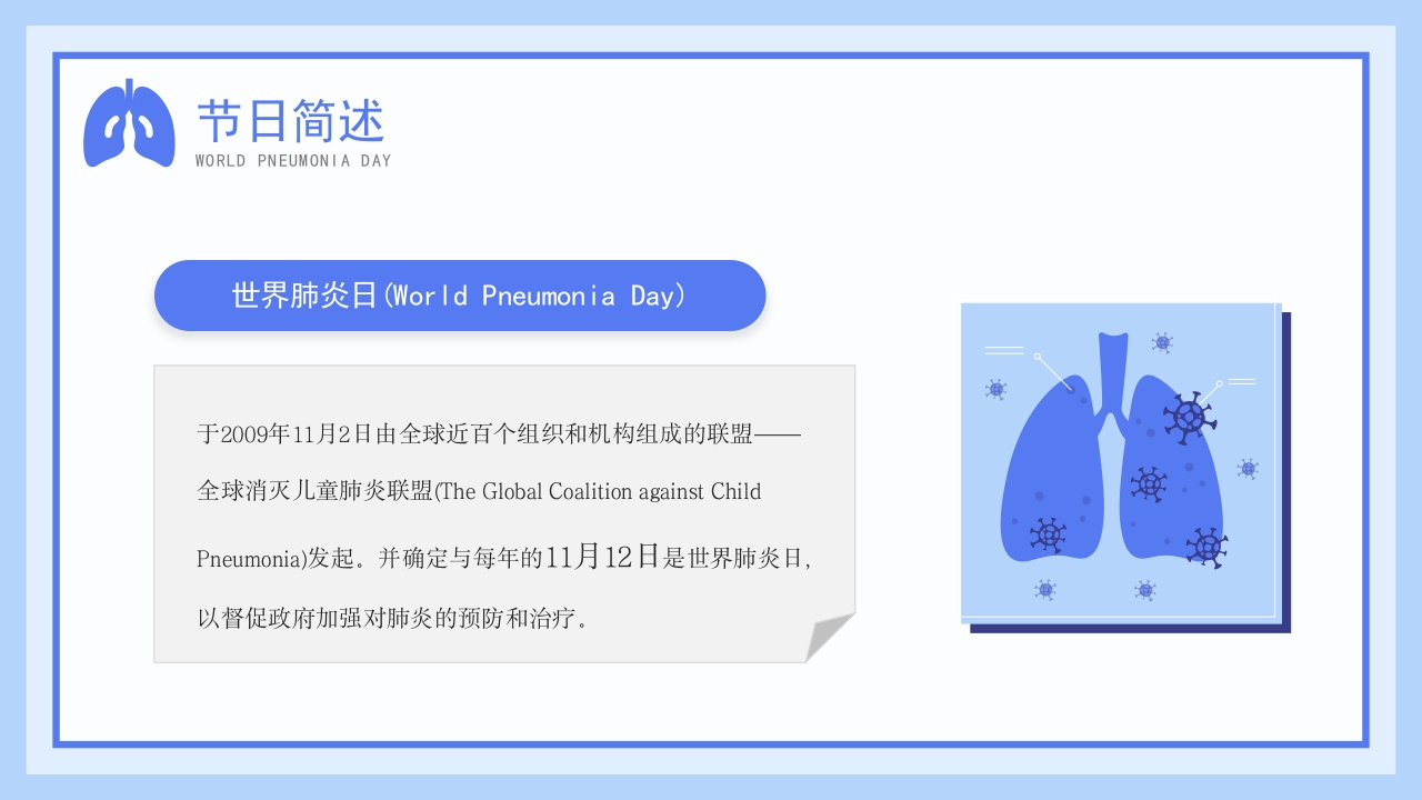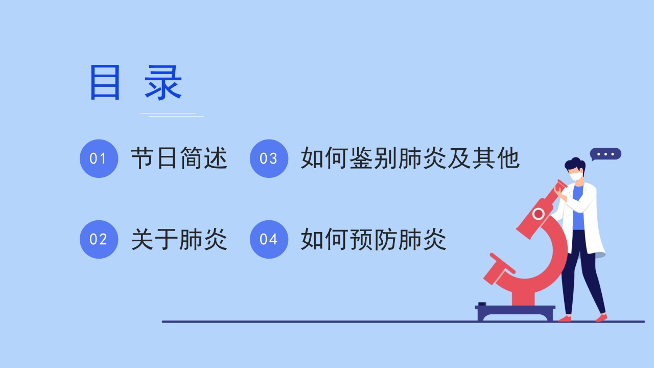 关注肺炎的预防和治疗吊世界肺炎日11月12日世界肺炎日中小学生健康教育主题班会汇报人:XXX时间:20XX