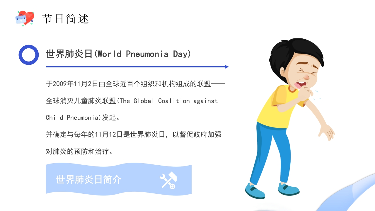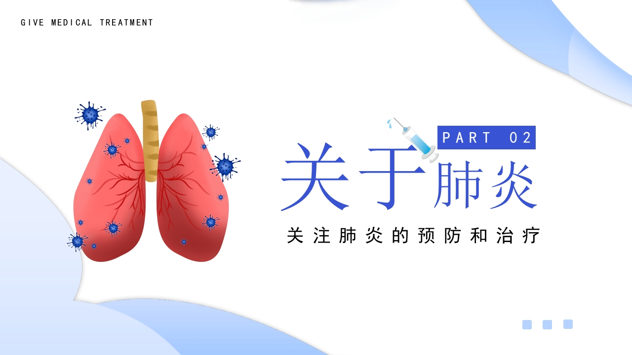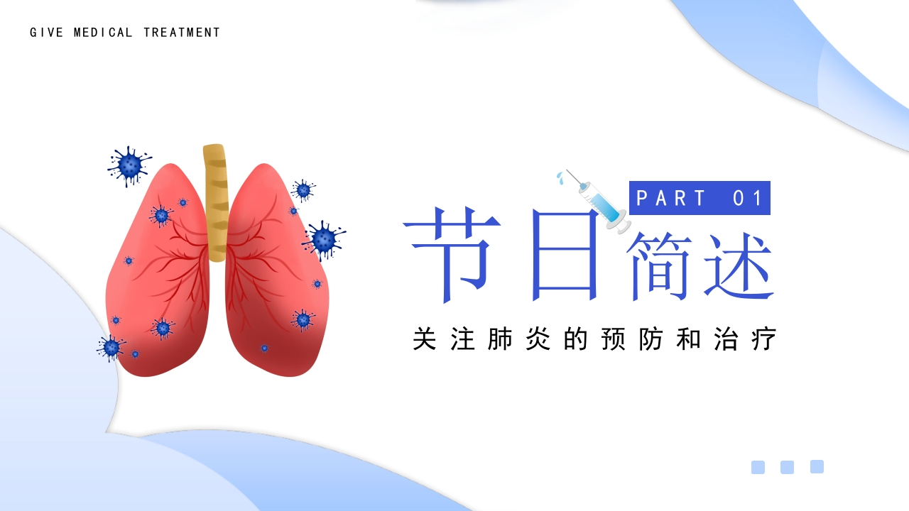 GIVE MEDICAL TREATMENT世界帅炎目WORLD PNEUMONIA DAY关注肺炎的预防和治疗主讲人:xxx日期:2022.XX