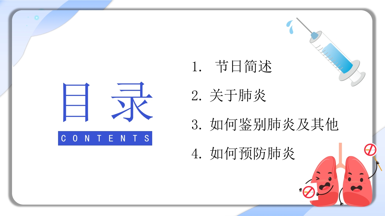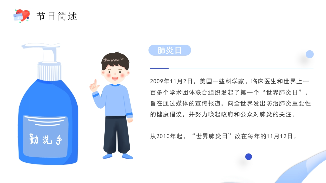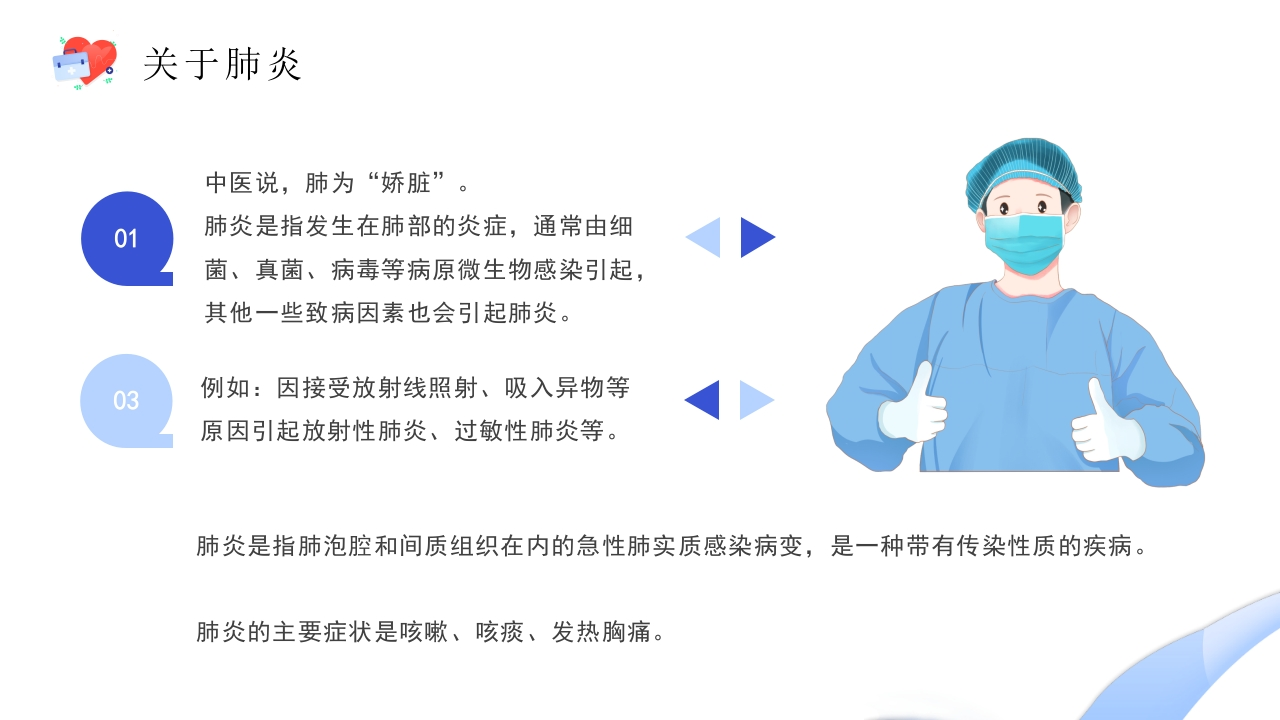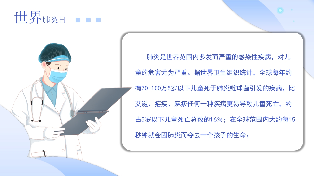 GIVE MEDICAL TREATMENT世界帅炎目WORLD PNEUMONIA DAY关注肺炎的预防和治疗主讲人:xxx日期:2022.XX