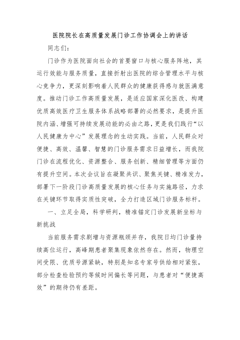 医院院长在高质量发展门诊工作协调会上的讲话同志们:门诊作为医院面向社会的首要窗口与核心服务阵地,其运行效能与服务质量,直接折射出医院的综合管理水平与核心竞争力,更深刻影响着人民群众的健康获得感与就医满意度。推动门诊工作高质量发展,是适应国家深化医改、构建优质高效医疗卫生服务体系战略部署的必然要求,是提升医院内涵、增强可持续发展动能的必由之路,更是我们践行“以人民健康为中心”发展理念的生动实践。当前,人民群众对便捷、高效、温馨、智慧的门诊服务需求日益增长,而我院门诊在流程优化、资源整合、服务创新、精细管理等方面仍有提升空间。本次会议旨在凝聚共识、聚焦关键、精准发力,部署下一阶段门诊高质量发展的核心任务与实施路径,力求在关键环节取得实质性突破,全力打造区域门诊服务标杆。一、立足全局,科学研判,精准锚定门诊发展新坐标与新挑战当前服务需求剧增与资源瓶颈并存,我院日均门诊量持续高位运行,高峰期患者聚集现象依然存在。然而,物理空间受限、优质号源紧缺,特别是知名专家号供给相对紧张,部分检查检验预约等候时间偏长等问题,与患者对“便捷高效”的期待仍有差距。