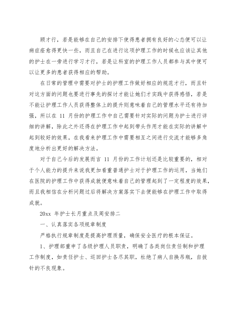 20xx年护士长月重点及周安排写总结时要认真分析、比较,写出自己的特色。有些单位或个人的总结“几年一贯制”,内容差不多,只是换了某些数字,这样的总结就缺乏价值。整理了20xx年护士长月重点及周安排,希望能帮助到您。20xx年护士长月重点及周安排身为护士长的我面对11月份的挑战自然要做好所在科室的护理人员管理工作,尽管在过去的经历中自己凭借着较好的积累完成了院方布置的护理工作,但是在最近的几次会议中也让我认清了目前阶段护士的工作并不轻松,因此面对严峻的形势也需要早做打算才能获得患者与家属对护理人员的认可,所以一份较好的护士长工作计划可以帮助自己在即将到来的11月份更好地完成任务。鉴于10月底到11月初来到医院进行实习的新护士较多需要做好培训工作,因此我需要提前做好相应的安排才能够让她们将所学的知识与护理工作结合起来,如果因为手法不专业从而导致患者感到不满可就有些得不偿失了,即便实习生的到来可以减缓护理工作者人手不足造成的压力也应该有所重视,而且11月份的时候自己也应该多在各个病房进行走动以便于解决难题,当结束一天的护理工作以后还应该召开临时会议探讨各成员遇到的问题与自身的不足,而且对于新护士在工作期问撰写的报告需要认真检查才能更好地分析实际问题。11月份的到来也意味着天气的寒冷可能造成患者的病情加剧,所以我在11月份需要向后勤部门申请一批被单给体质较差的一部分患者使用,而且对于家境较差和没有家属探望的患者需要重点进行照