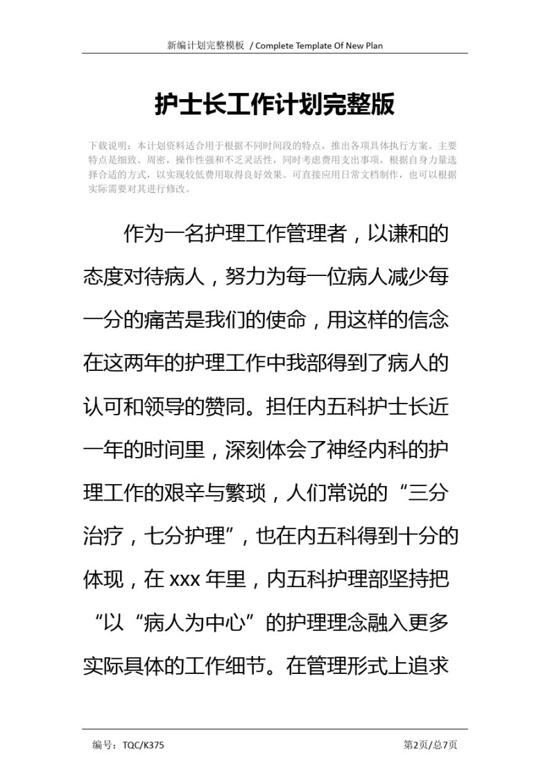 编号:TQC/K375护士长工作计划完整版LBBGUBKCB888818688808888888688867888688678860According to the characteristics of different time periods,the specific implementation plan isput forward.At the same time,considering the cost,according to their own choice ofappropriate way,in order to achieve low cost and achieve good results.【适用制定规则/统一目标/规范行为/增强沟通等场景】编写审核:时间:部门: