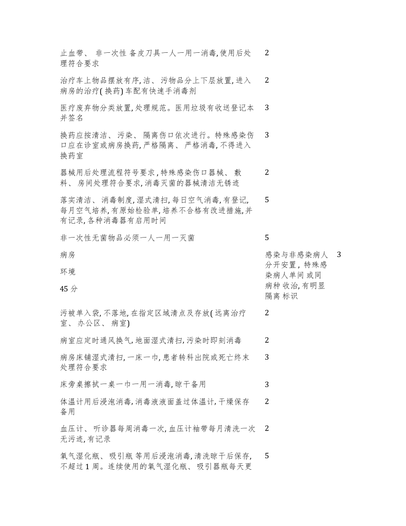 临床护士长工作手册模板博州x双医院消毒隔离质量评分表(100分)质量分:90分合格率:95%检查检查内容分值项目治疗室换药室55分工作人员入室衣帽5整洁,戴口罩,操作前后规范洗手或手消毒,严格执行无菌操作原则。严格区分清洁区、污染区,标识醒目规范,有擦桌巾、擦5瓶巾并正确使用。无菌物品专柜放置(离地20cm,距墙5cm),柜内清洁,标5识清楚,无过期,消毒包体积符合要求(30cm×30cm×50cm),包布洁净无破损、无碳化非一次性盛放碘酒、酒精等容器每周消毒、更换2次,3同时更换消毒剂,并注有双日期,使用的皮肤消毒剂有盖,不入工作服口袋抽出的药液,开启的静脉输入无菌液体有开启时间,超过25小时不得使用,启封、抽吸的溶煤有启用时间,超过24小时不得使用,配制的肝素盐水不超过2小时,冰箱内存放的药品有开瓶时间胰岛素启封后不超过30天,抽出的药液不超过2小时,无菌物品、储槽、敷料缸等一经打开,有开启时间,24小时内使用,无菌盘4小时更换抗生素、皮试液现用现配,一人一针一管执行率100%,2注射药液〔粉)抽吸(溶解)完全,废弃药瓶内不得有剩余药1和未融化的药粉存在一次性无菌物品用后及时毁形,不重复使用,锐器盒使用2符合要求各种消毒液配置正确,检测浓度达标,定期更换,护士知晓5消毒液浓度及配置、使用方法