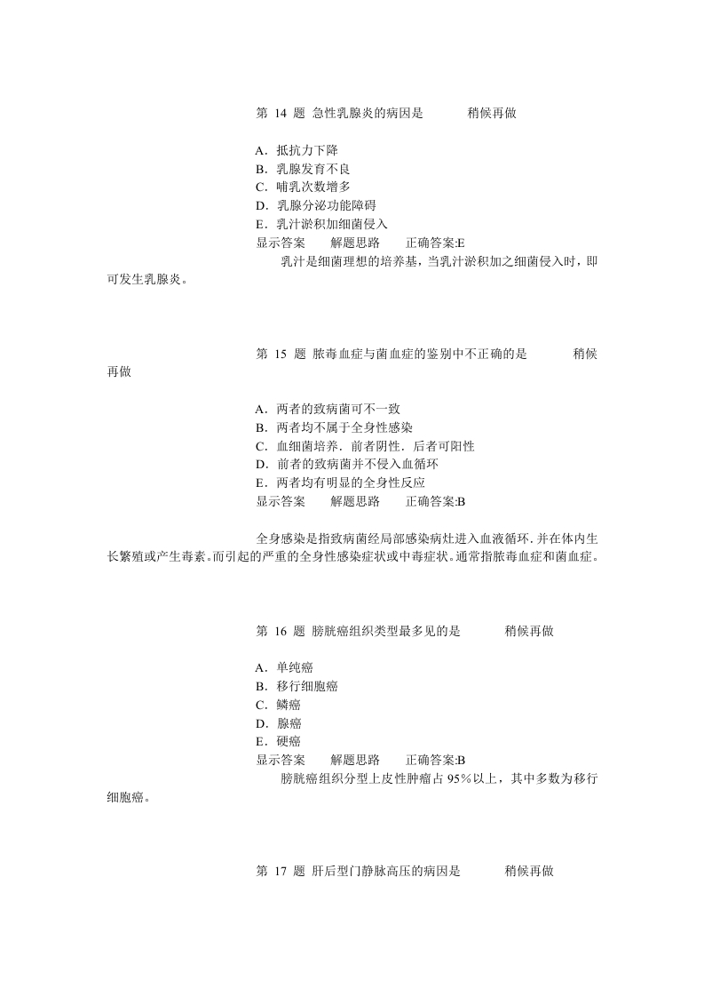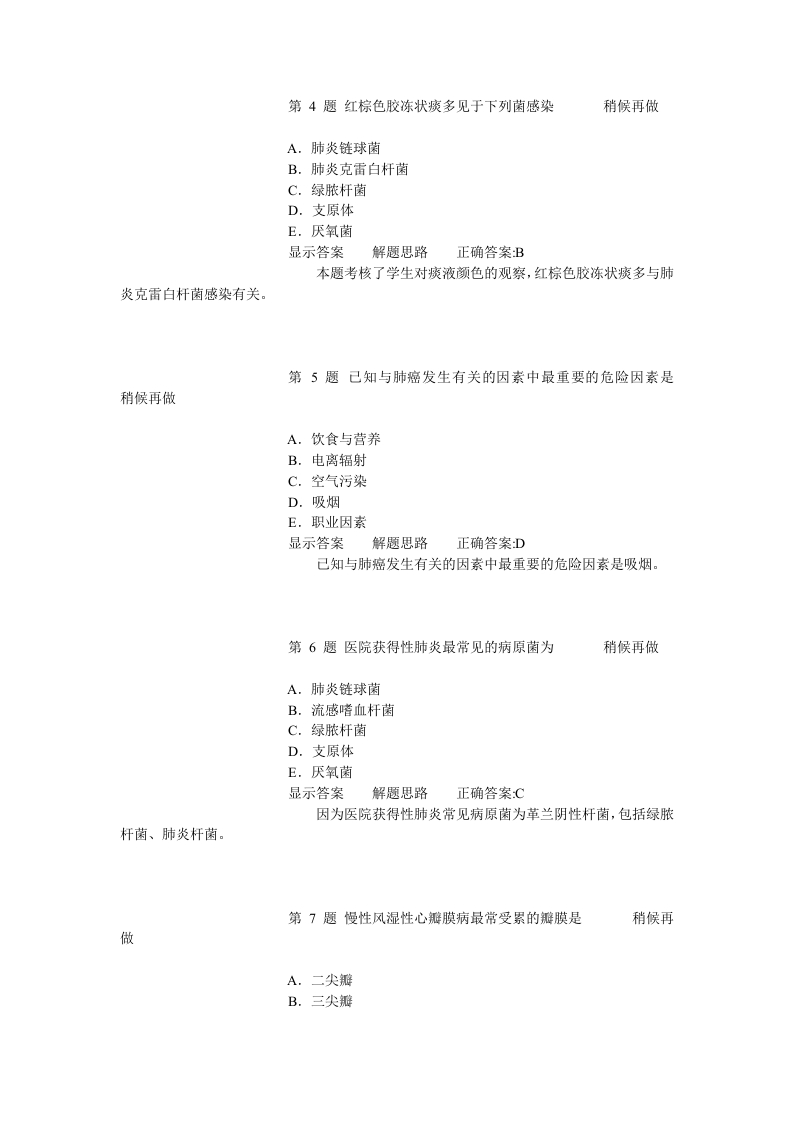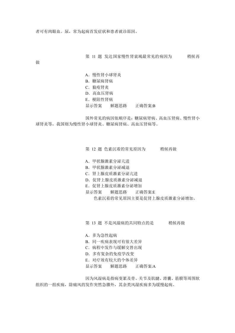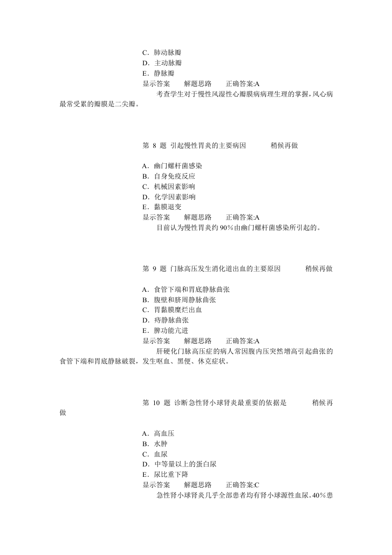模拟试卷(1)一、A1型题:每一道考试题下面有A、B、C、D、E五个备选答案。请从中选择一个最佳答案。第1题6个月~6岁小儿血红蛋白正常值的下限是稍候再做A.80g/LB.90g/LC.110g/LD.120g/LE.130g/L显示答案解题思路正确答案C6个月~6岁小儿血红蛋白低于110g/L,6~14岁小儿低于120g/L为诊断贫血标准。第2题镜下血尿是指离心沉淀后的尿沉渣在每高倍视野中平均见到的红细胞数为稍候再做A.3个以上B.4个以上C.5个以上D.6个以上E.7个以上显示答案解题思路正确答案:A离心沉淀后的尿沉渣在每高倍视野中平均见到3个以上红细胞,称镜下血尿。第3题成人24小时正常尿量为稍候再做A.500-1000ml/dB.10001500ml/dC.1000-2000ml/dD.1500~2000ml/dE.1500-2500ml/d显示答案解题思路正确答案C成人24小时正常尿量为1000-2000ml/d.