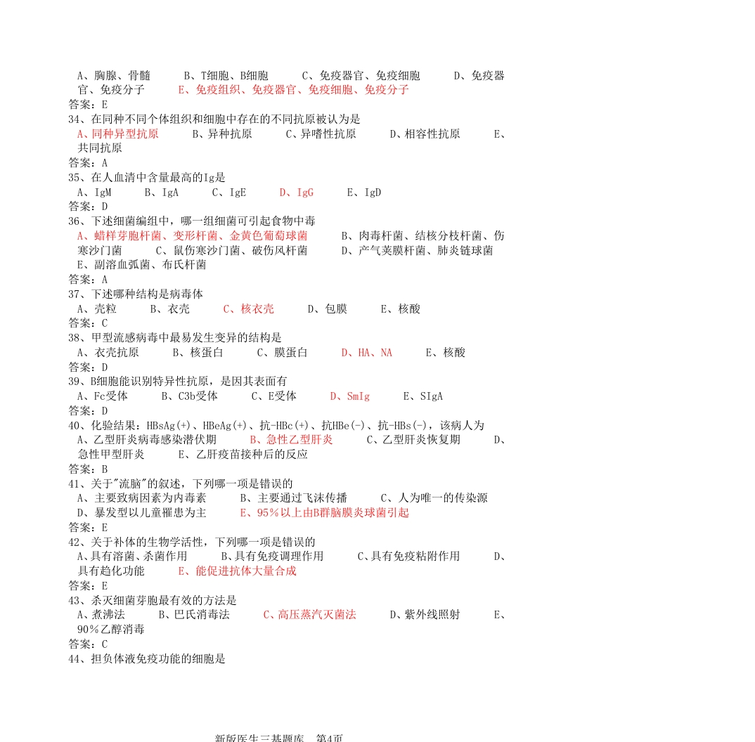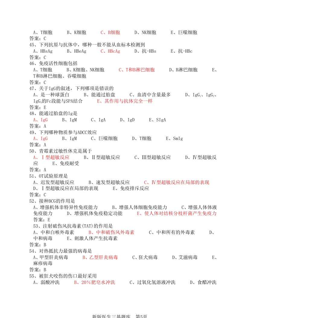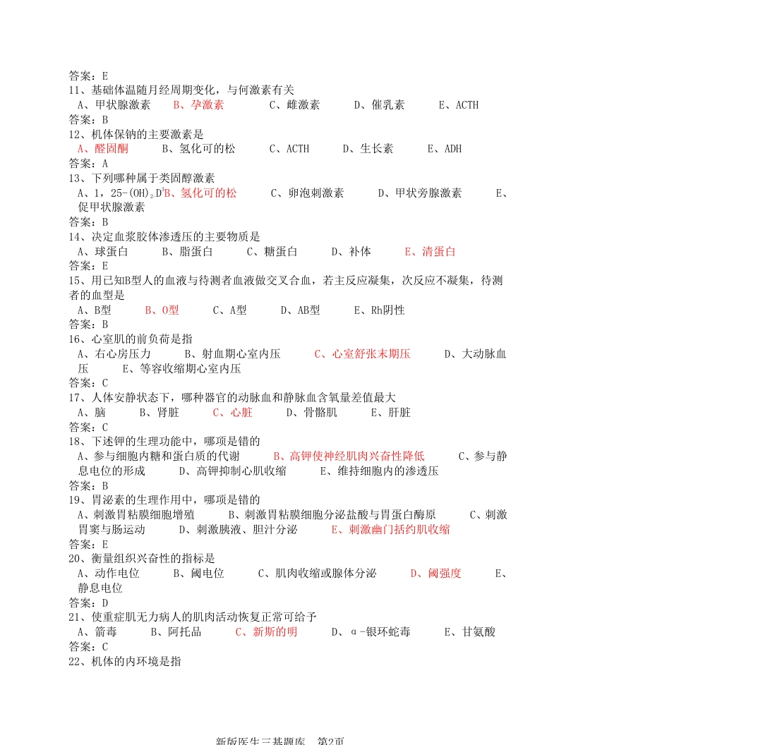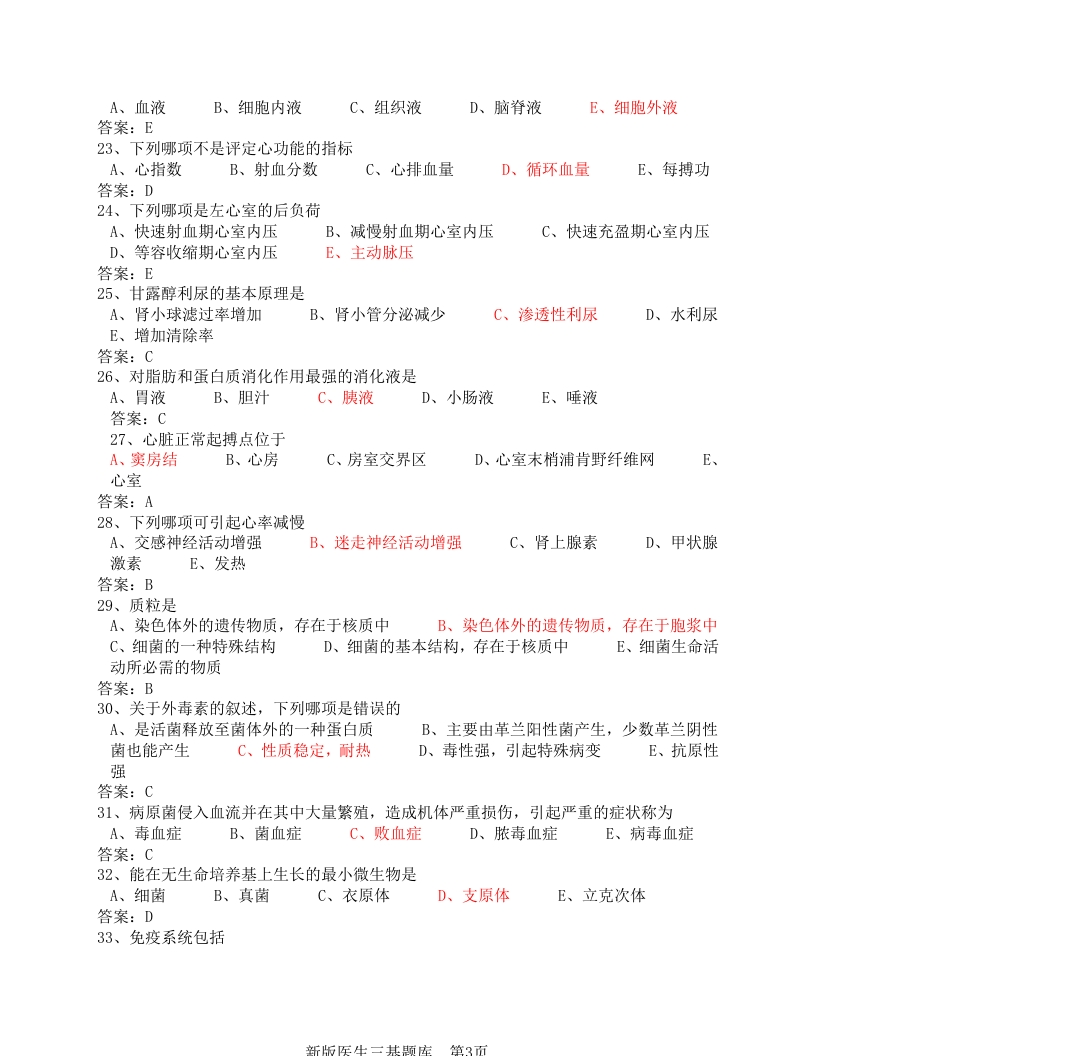 新版医生三基题库一、(共742分)题下选项可能多个正确,只能选择其中最佳的一项1、颞区外伤引起急性硬膜外血肿,最常见损伤的血管是A、颞浅动脉B、大脑中动脉C、脑膜中动脉D、板障静脉E、乙状窦答案:C2、肱骨外科颈骨折损伤腋神经后,肩关节将出现哪些运动障碍内收D、A、不能屈B、不能伸C、不能内收D、不能外展E、不能旋转答案:D3、氢化可的松的主要作用是A、降低血糖B、减少嗜酸性粒细胞和淋巴细胞C、减少体内水的排出D减少血小板和红细胞E、激活儿茶酚氧位甲基转移酶答案:B4、同时影响肾小球滤过和肾小管重吸收的因素是A、血浆胶体渗透压B、滤过膜的通过性C、血液中葡萄糖D、抗利尿激素E、醛固酮答案:A5、某人的红细胞与B型血血清凝集,而其血清与B型血的红细胞不凝集,此人血型为A、A型B、B型C、0型D、AB型E、Rh型答案:D6、心肌不会产生强直收缩,其原因是A、心脏是功能上的合胞体B、心肌肌浆网不发达,储Ca少C、心肌有自律性,呈自动节律收缩D、心肌的有效不应期长E、心肌呈”全或无“收缩答案:D7、肾素-血管紧张素系统活动增强时A、醛固酮释放减少B、静脉回心血量减少C、体循环平均充盈压减低D、交感神经末梢释放递质减少E、肾脏排钠量减少答案:E8、最重要的消化液是A、唾液B、胃液C、胆汁D、胰液E、肠液答案:D9、大量饮清水后尿量增多,主要是由于A、肾小球滤过率增加B、血浆胶体渗透压降低C、抗利尿激素分泌减少D、醛固酮分泌减少E、囊内压降低答案:C10、切除狗的肾上腺皮质,出现A、血容量↓,血钠↓,尿钾↑B、血容量↓,血钠↑,尿钾↑C、血容量,,血钠↑,尿钾↓D、血容量↑,血钠↓,尿钾↑E、血容量↓,血钠↓,尿钾↓断版医生二基颗库第1而