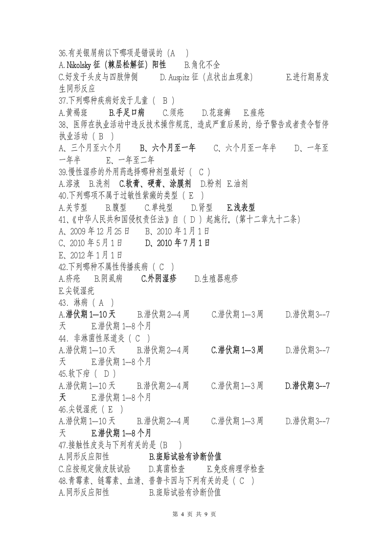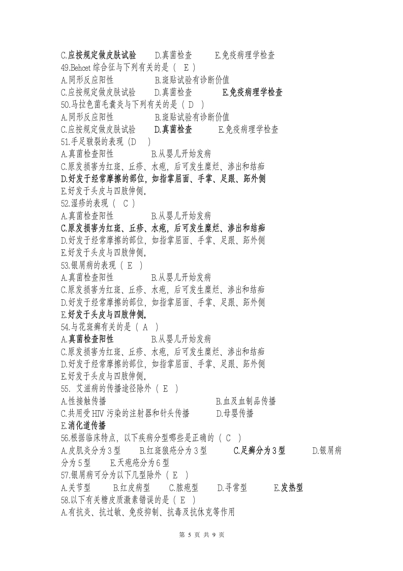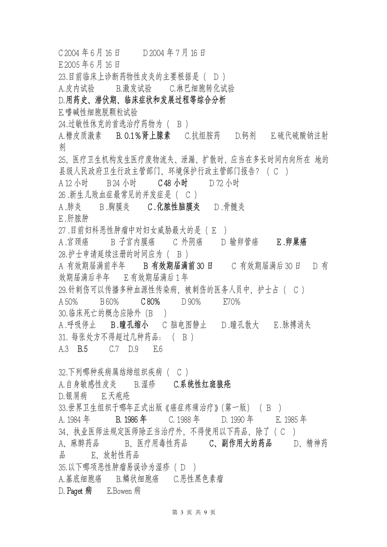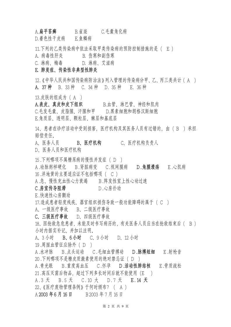 20xx年度xx双“三基三严”理论考试试题科目:医疗一综合套数:第2套一、单选题(共80题,每题1分,共80分)1.下述哪项不符合“2000年人人享有卫生保健”的目标(C)A.人们懂得自己有力量摆脱疾病的桎档B.不同国家地区或人群较均匀地分配卫生资源C.人们所患的疾病都能治愈D.从婴幼儿直到老年都能健康地渡过一生E.人们从小到老都能方便地享受到各种卫生保健服务2.胸骨角两侧平对(D)A.第5肋B.第4肋C.第3肋D.第2肋E.第1肋3.正常皮肤对各种化学物质都有一定的屏障作用,屏障部位主要在(C)A皮下组织B.棘细胞层C角质层D,基底层E真皮层4.关于皮肤病的特点,下列哪项是正确的(B)A棘层松解见于湿疹B.角化不全常见于银屑病C.表皮内水疱见于盘状红斑狼疮D,基层液化见于天疱疮E色素增多见于白癜风5.休克时正确的补液原则是(B)A.补液“宁多勿少”B.“需多少,补多少”C.补充丧失的部分液体和当天继续丧失的液体D.“失多少,补多少”E如血压正常不必补液6.属非细胞型微生物的是(E)】A.立克次体B.衣原体C.真菌D,支原体E.病毒7.下列哪种属甲类传染病(A)A.霍乱B.艾滋病C梅毒D.炭疽E.麻疹8急性渗出性湿疹选择最佳剂型为(D)A.酊剂B.软膏C霜剂D.溶液E洗剂9.抗组胺药的作用是(D)A减少组胺的释放B破坏组胺C.拮抗组胺D.与组胺竞争某些受体E抑制肥大细胞生成10.以下哪种病不是遗传性疾病(A)第1页共9页