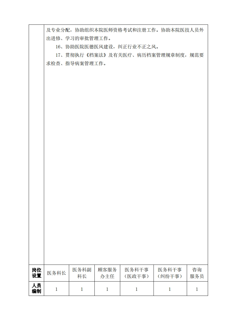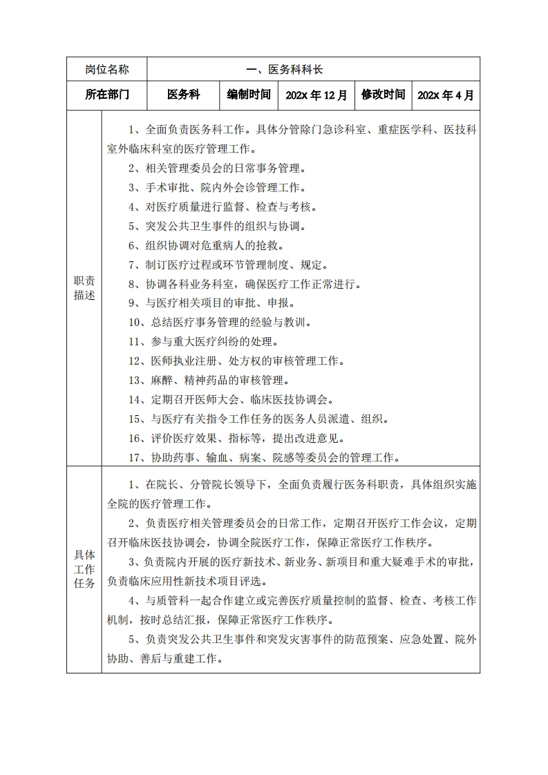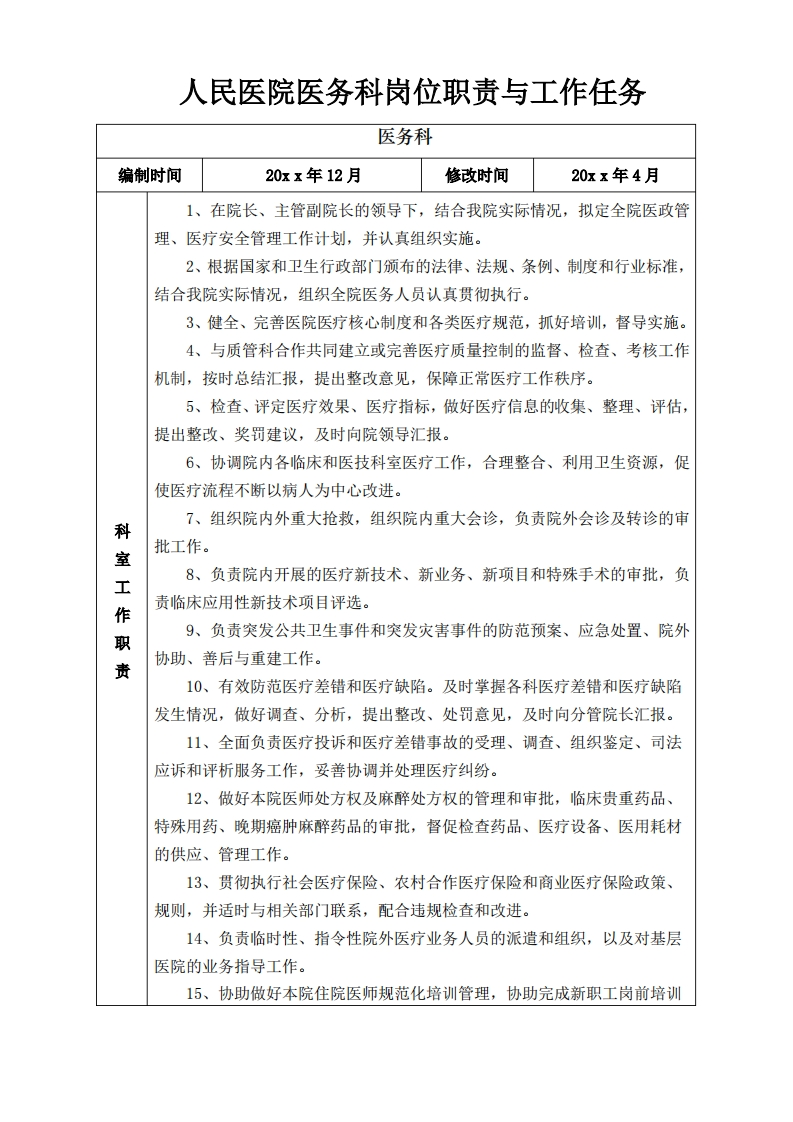 人民医院医务科岗位职责与工作任务医务科编制时间20xx年12月修政时间20xx年4月1、在院长、主管副院长的领导下,结合我院实际情况,拟定全院医政管理、医疗安全管理工作计划,并认真组织实施。2、根据国家和卫生行政部门颁布的法律、法规、条例、制度和行业标准,结合我院实际情况,组织全院医务人员认真贯彻执行。3、健全、完善医院医疗核心制度和各类医疗规范,抓好培训,督导实施。4、与质管科合作共同建立或完善医疗质量控制的监督、检查、考核工作机制,按时总结汇报,提出整改意见,保障正常医疗工作秩序。5、检查、评定医疗效果、医疗指标,做好医疗信息的收集、整理、评估,提出整改、奖罚建议,及时向院领导汇报。6、协调院内各临床和医技科室医疗工作,合理整合、利用卫生资源,促使医疗流程不断以病人为中心改进。7、组织院内外重大抢救,组织院内重大会诊,负责院外会诊及转诊的审科室批工作。工8、负责院内开展的医疗新技术、新业务、新项目和特殊手术的审批,负责临床应用性新技术项目评选。作职9、负责突发公共卫生事件和突发灾害事件的防范预案、应急处置、院外责协助、善后与重建工作。10、有效防范医疗差错和医疗缺陷。及时掌握各科医疗差错和医疗缺陷发生情况,做好调查、分析,提出整改、处罚意见,及时向分管院长汇报。11、全面负责医疗投诉和医疗差错事故的受理、调查、组织鉴定、司法应诉和评析服务工作,妥善协调并处理医疗纠纷。12、做好本院医师处方权及麻醉处方权的管理和审批,临床贵重药品、特殊用药、晚期癌肿麻醉药品的审批,督促检查药品、医疗设备、医用耗材的供应、管理工作。13、贯彻执行社会医疗保险、农村合作医疗保险和商业医疗保险政策、规则,并适时与相关部门联系,配合违规检查和改进。14、负责临时性、指令性院外医疗业务人员的派遣和组织,以及对基层医院的业务指导工作。15、协助做好本院住院医师规范化培训管理,协助完成新职工岗前培训