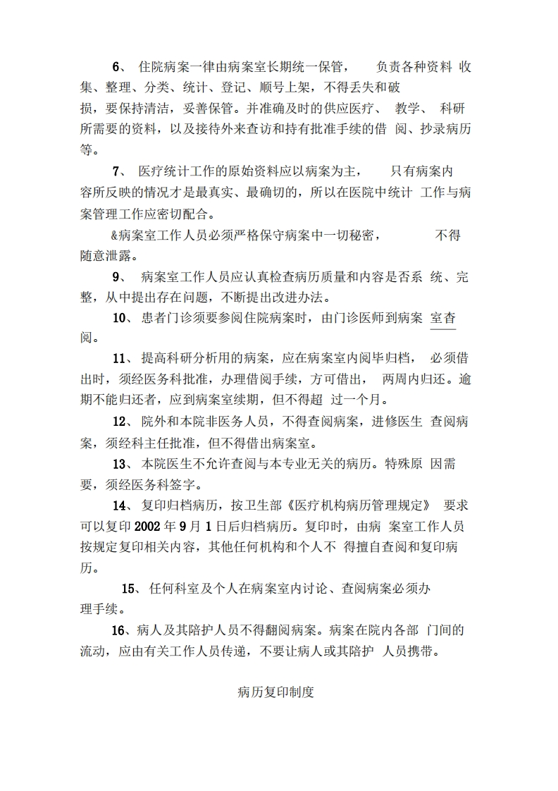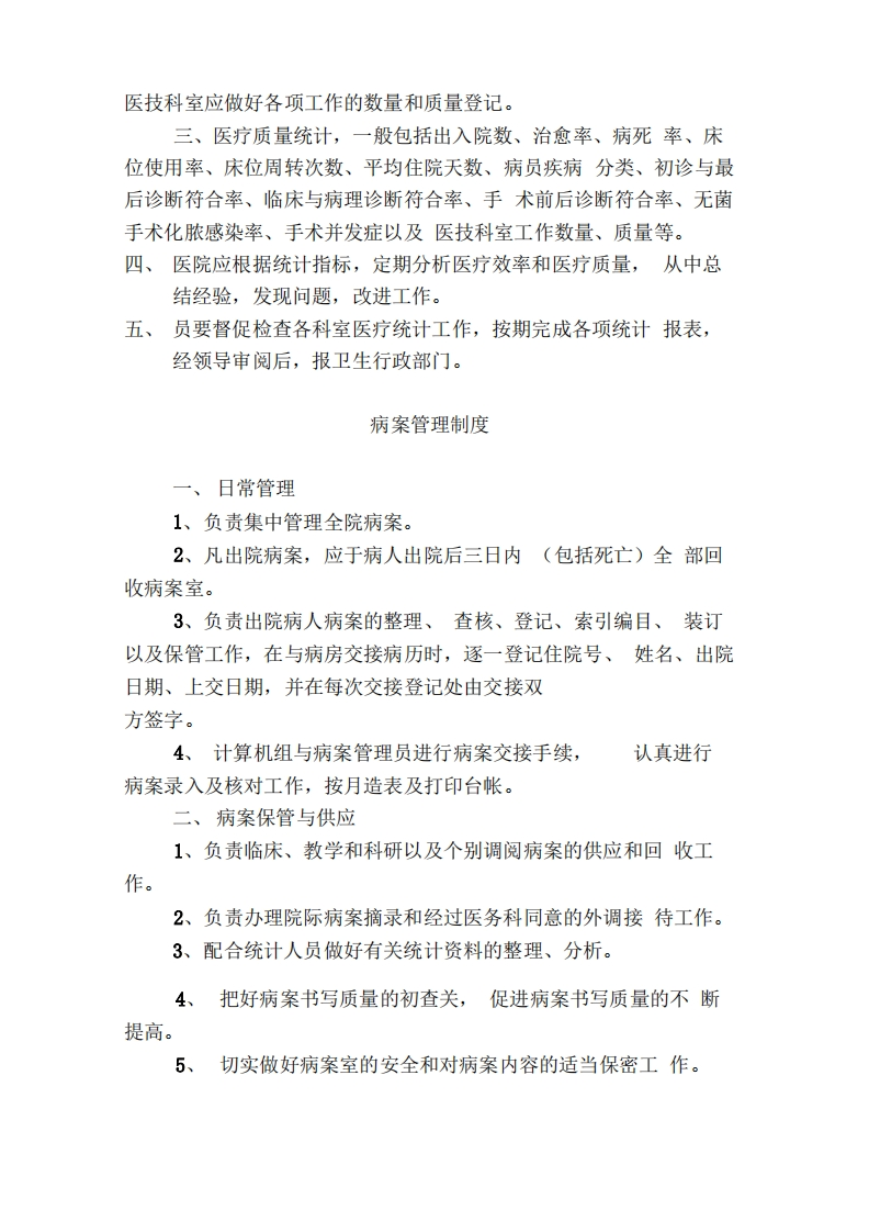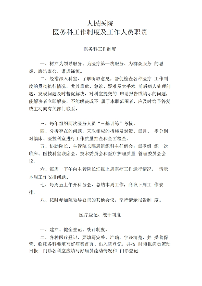 人民医院医务科工作制度及工作人员职责医务科工作制度一、树立为领导服务、为医疗第一线服务、为群众服务的思想,廉洁奉公,谦虚谨慎。二、经常深入科室,了解听取意见,督促检查各种医疗工作制度的贯彻执行情况,尤其重危、急诊、疑难及大手术前后病人处理问题,发现问题及时督促解决,对科室提交的申请报告或请示的问题,能解决者立即解决,不能解决或不属于本职范围者,应及时给予答复或主动向有关部门联系。三、每年组织两次医务人员“三基训练”考核。四、分析存在的问题,采取相应的措施及对策。每月、季分别对临床、医技科室进行工作质量抽查和全面检查。五、协助院长、主管院长隔周组织科主任例会:每季组织一次临床、医技科室联席会、技术委员会和医疗护理质量管理委员会会议。六、每周一下午向主管院长汇报上周医疗工作运行情况,请示本周工作安排问题。七、每周五上午开科务会,总结本周工作,商议下周工作安排。八、按时参加院领导召集的其他会议,坚持请示报告制度。医疗登记、统计制度一、建立、健全登记、统计制度。二、各种医疗登记,要填写完整、准确,字迹清楚,并妥善保管。临床各科要填写好病案首页、出入院登记,并按时填报病员流动日报:门诊各科室应填写好病员流动情况和门诊登记: