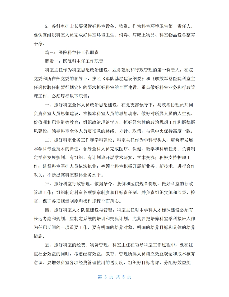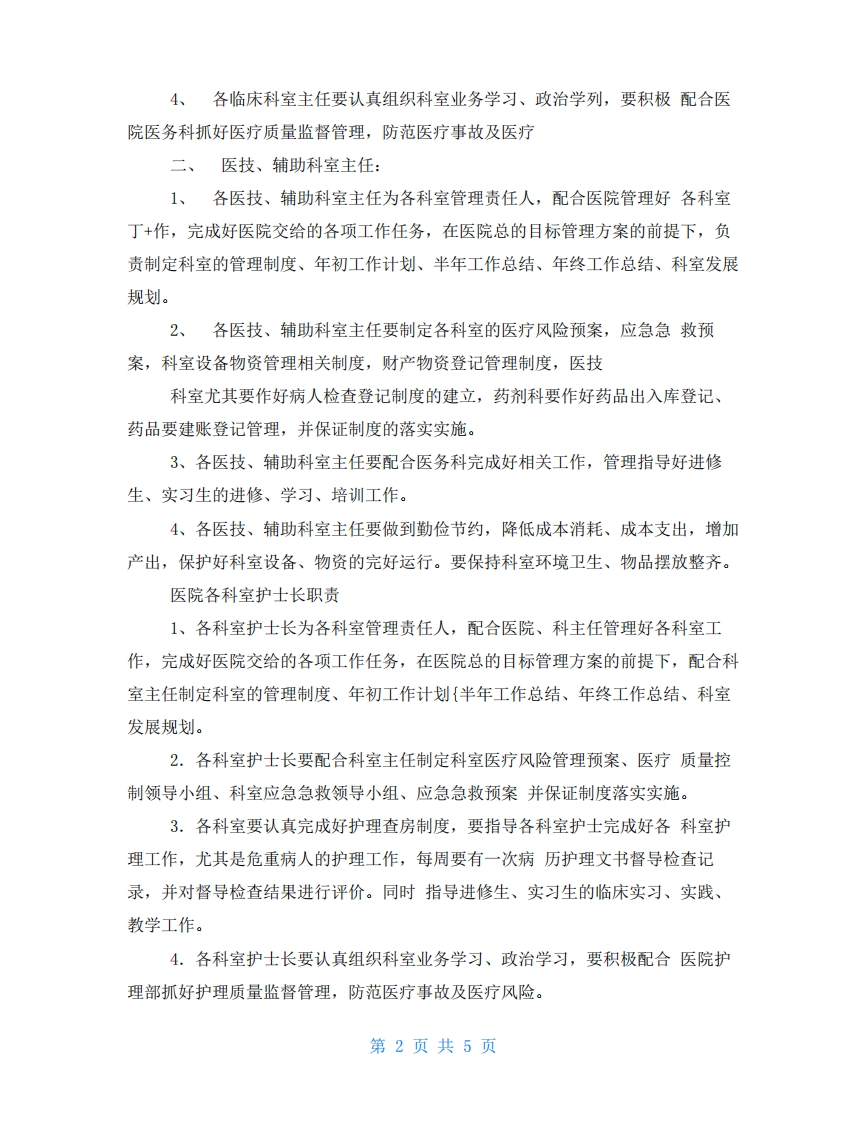 医院医务科主任工作职责篇一:医务科副主任职责南宫市中医院医务科科副主任职责1、在院长、分管院长指导下,协助主任实施全院的医疗业务管理。2、督促检查各项医疗规章制度的执行落实情况,定期分析总结。3、参与医院重大医疗抢救和院内会诊,参与全院性病例讨论。4、负责组织有关医疗管理活动及专题讲座。5、负责进修医师及医师进修的管理,做好考核、考试、鉴定工作。6、组织实施院外医疗急救、指令性医疗保障任务及院内外健康知识讲座。7、每月对医疗工作缺陷汇总分析、及时汇报,指导各科室预防医疗缺陷,杜绝事故。8、执业医师的注册管理。9、完成主任交办的临时性工作。篇二:医院各科室主任职责医院各科室主任职责一、临床科室:1、各临床科室主任为各科室管理责任人,配合医院管理好各科室工作,完成好医院交给的各项工作任务,在医院总的目标管理方案的前提下,负责制定科室的管理制度、年初工作计划、半年工作总结、年终工作总结、科室发展规划。2、各临床科室主任要制定科室医疗风险管理预案、医疗质量控制领导小组、科室应急急救领导小组、应急急救预案,并保证制度落实实施。3、各临床科室主任要认真完成上级医师查房制度,要指导住院医师完成住院医师查房制度的落实,每周要有一次病历文书督导检查记录,并对督导检查结果进行评价。同时指导进修生、实习生的临床实习、实践、教学工作。第1页共5页