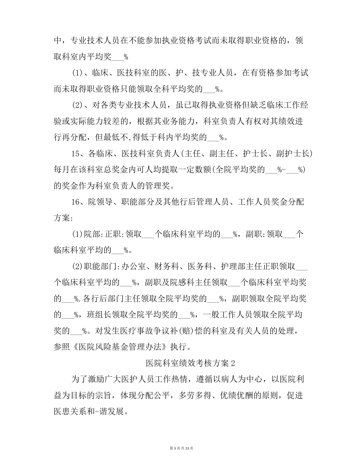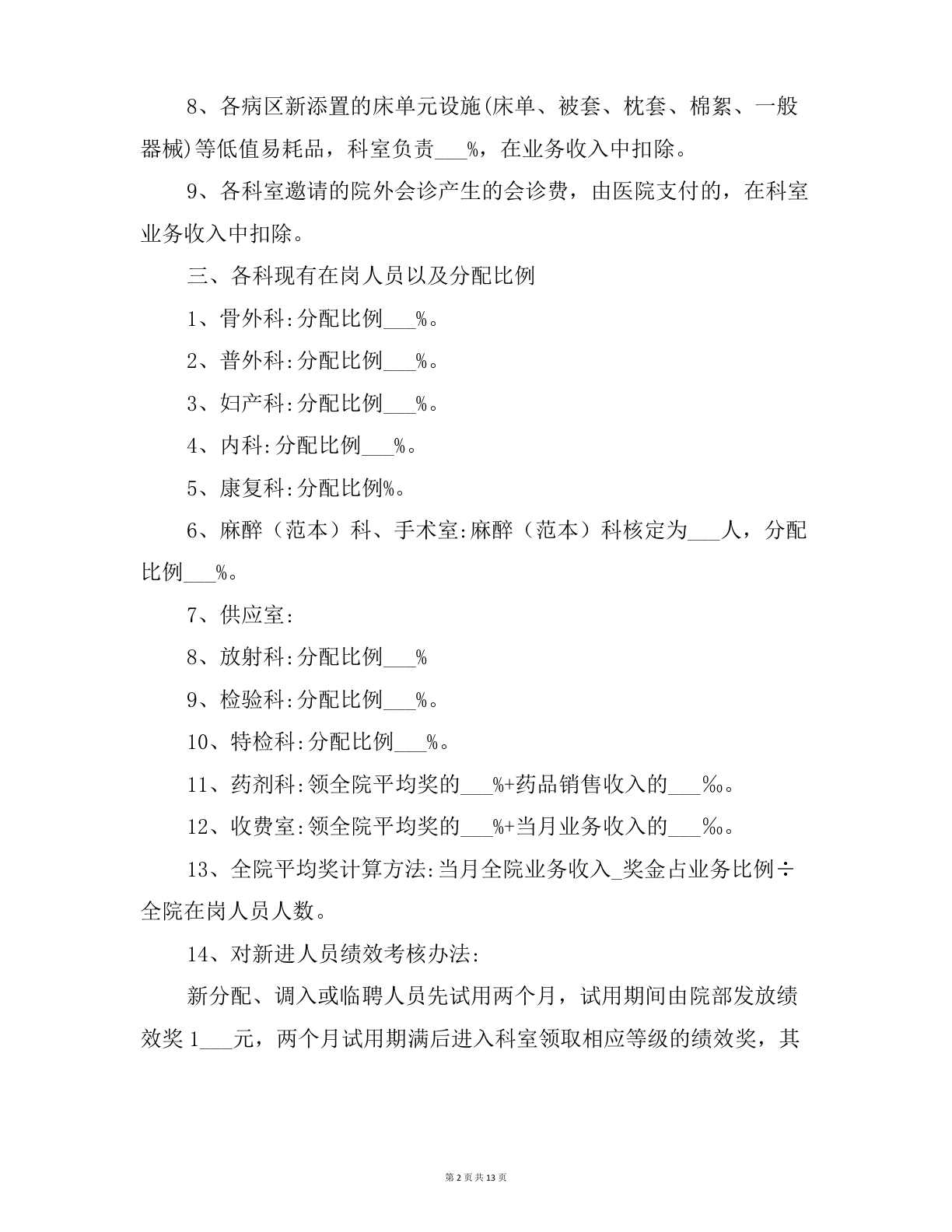 2022年医院科室绩效考核方案根据卫生局相关文件精神,为充分体现我院一线临床、医技人员的劳动价值,根据科室对医院贡献大小(人均产值),劳动强度,风险程度,社会效益等。结合医院的实际情况,经院办公会研究制定我院年奖金分配方案:奖金=(收入%-支出)分配比例%一、收入部分住院病区及手术室麻醉(范本)科:住院费、治疗费、处置费、手术费%、监护费、腹腔镜收费分摊标准同上年。二、支出部分1、各科室消耗的一次性材料(分装袋、注射器、纱布、棉垫、医用脱脂棉)、及其他医用耗材、水电费、值班费、餐费、电话费、科内临工费、洗浆费、人员工资。要求行后主任准确记录,月末按时交到财务科。2、设备维修费、零配件更换材料费,要求设备科准确登记,月末按时报财务科。3、各临床,医技科室外出参加学术会议及学习班,所产生的费用。4、各临床科室在医疗活动中产生的一切业务支出,在科室业务收入中扣除。5、各科室领取的医疗文书纸张等。6、骨科、普外科的特殊材料(内固定材料、补片等)。不计入科室业务收入中。7、各科室在供应室产生的消毒费。第1页共13页
