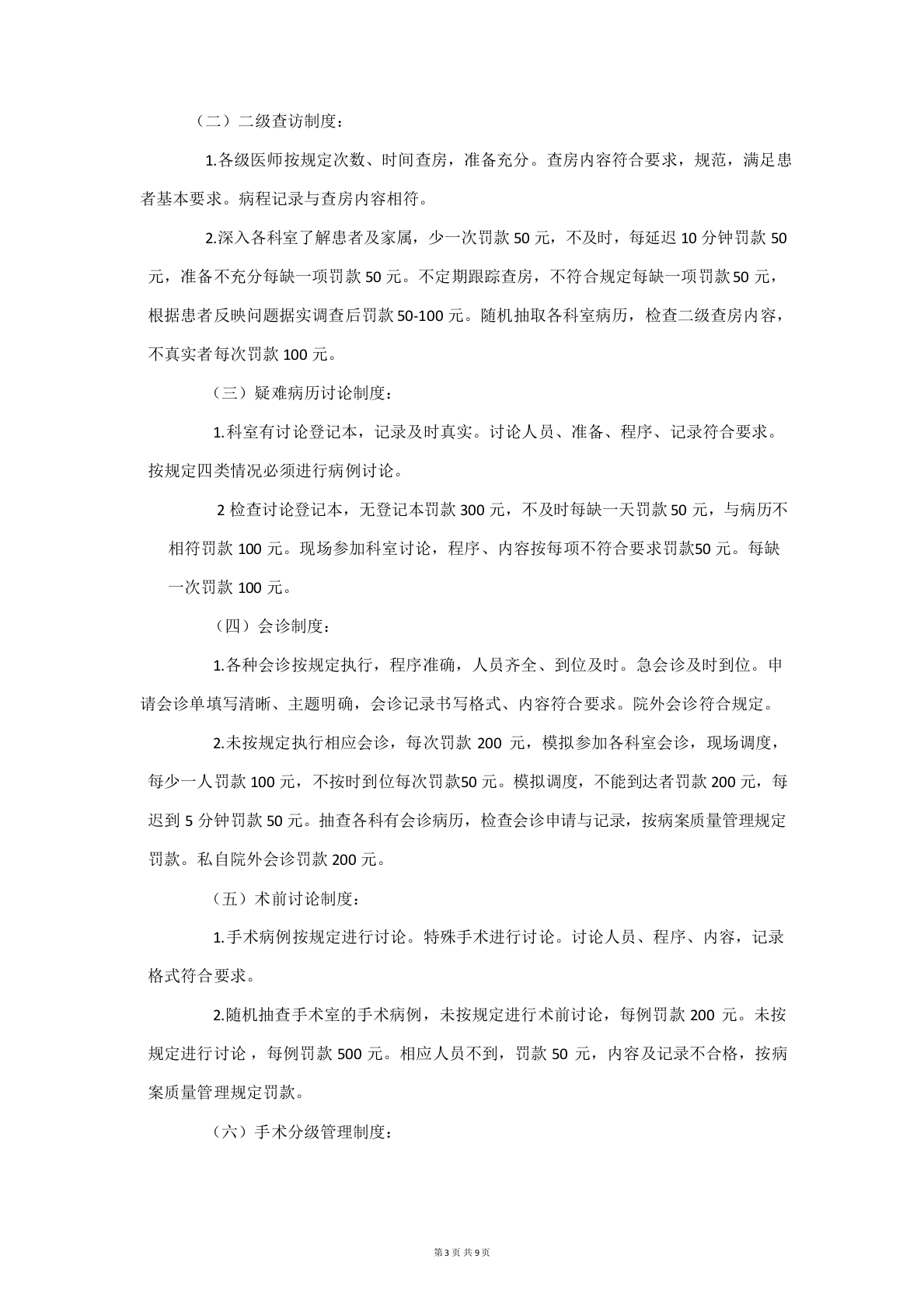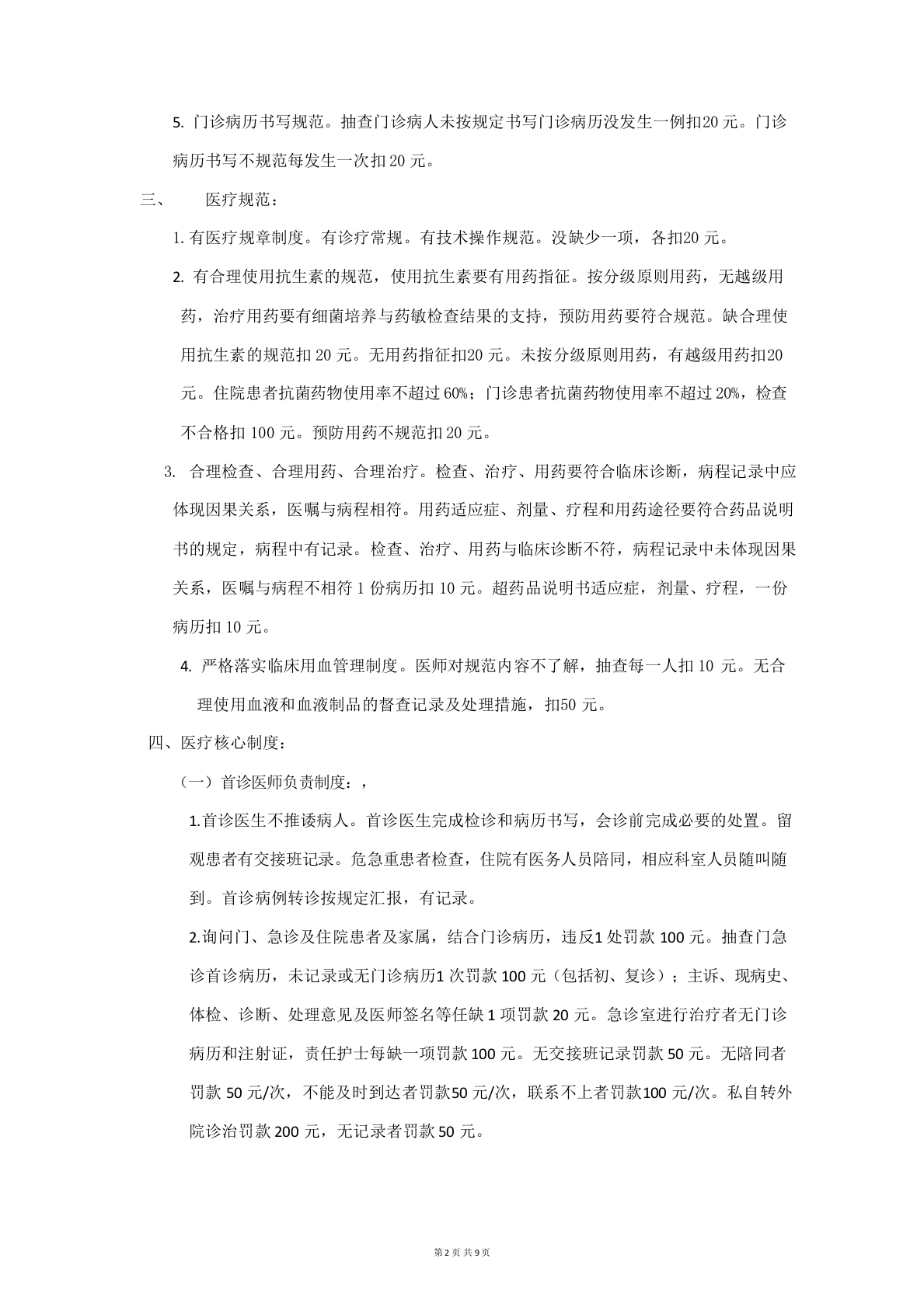 医疗管理制度质量管理:1.科主任负责质量管理与持续改进工作,建立科室质量管理小组及工作制度,体现全面管理与持续改进工作。缺科室质量管理小组及制度扣20元。科室质量存在问题改进力度不够,相同质量问题重复出现无改进扣50元。2.每月底要召开质量管理小组会议,内容要体现全面、全过程质量管理,有记录。未按规定召开科室质控管理小组会议每缺一次扣20元。缺改进工作措施记录每缺一次扣20元。3.严格执行医师法,在未取得执业医师资格,不能独立值班、手术、有创操作。发现无资格医师独立值班每发生一次扣50元。发现无资格医师独立会诊每发生一次扣50元。发现无资格医师独立手术每发生一次扣100元。发现无资格医师独立有创操作每发生一次扣100元。4.积极引进新技术、新业务,有相关培训内容,讨论,记录和操作规程,有代表科室特色及水平的技术项目。有开展新技术、新业务工作奖励500元。5.有三基培训计划,有三基培训落实记录,有三基培训考核记录。无“三基”培训计划扣50元。无“三基”培训落实记录扣50元。无“三基”操作考核记录扣50元。6.临床路径落实规范。入径病历未按治疗方案执行每一例扣20元。发生变异病历要进行登记,病程记录中要详细记录并与医嘱相符,其中一项未做到扣20元。7.修订科内常见疾病诊疗常规,各种手术操作常规及落实。未按时按照要求修订诊疗常规扣20元。未按时限要求制定各种手术操作扣20元。在医疗工作中未落实常规发生一次20元。二、医疗文书:1.有运行病历自查情况记录。无运行病历自查情况记录扣20元。记录不完善扣20元。2.有终未病历自查情况记录。无终未病历自查情况记录扣20元。记录不完善扣20元。3.住院病历书写规范。单项否决病历及≤75分病历不能出科室,每出科一份病历扣20元·4.门诊处方书写规范。门诊处方开具不规范,发现一次扣20元。第1页共9页