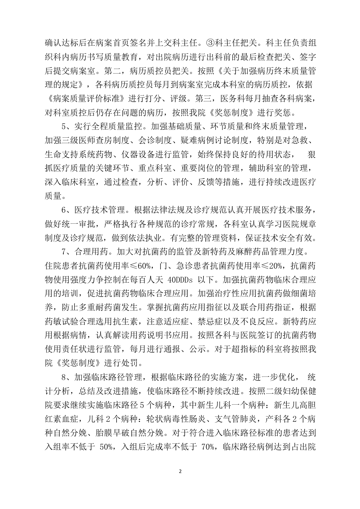 医疗质量管理1、加强组织领导、完善各项医疗质量管理制度,加强制度实施、考核及改进措施。每周定期到科室参加交班、查房及有关讨论等医疗活动。内容包括:医师交接班,包括科室实际交接班进行状况和书面记录;住院病历的书写质量:科室讨论制度的落实,包括危重病例讨论、疑难病例讨论、死亡病例讨论,详细了解其记录及执行情况:听取科主任对科室医疗运转、质量管理等情况,针对不足提出合理改进意见;协调各科室之间工作的开展,帮助各科解决工作中存在问题,如解决不了则反馈给院领导。为医院领导、科室主任分担负担,为医院领导和科室主任之间架起合格的桥梁。2、认真执行医疗质量三级控制实施体系,一级控制,医务人员自我控制:落实各级人员职责、规章制度、工作程序、技术规程。二级控制,科室控制。由科主任、护士长、骨干医师组成的科室质控小组,定期检查全科医务人员履行工作职责的情况,尤其是诊疗重点部门、关键环节的处置和实施期限,并通过病历记录体现落实情况。三级控制,院级及职能部门的质量控制。根据医疗质量考核标准,坚持每月、每季度组织实施全院性的医疗质量管理检查、考核、评价、分析、监督、反馈、持续整改等。3、严格执行医疗核心制度,即首诊负责制度、三级医师查房制度、疑难(危重)病人讨论制度、危重病人抢救制度、术前讨论制度、病历书写规范管理制度、会诊制度、查对制度、手术分级制度、死亡病例讨论制度、交接班制度、处方书写管理制度、病情告知制度、临床用血管理制度,同时规范落实转院转诊制度、医疗责任追究制度,使医务人员在诊疗活动中有章可循,服务过程程序化、标准化。4、病历质量管理。出院病历甲级率在90%以上,无丙级病历。病历质量的考核程序实行三级把关。第一,科室把好病历书写质量三关:①责任医师自检。检查各项书写是否及时、准确、客观、完整、系统、清晰、整洁、是否术语规范、语句流畅、文字精练、段落分明、内涵丰富、思路清晰、观点正确等,无拷贝错误。②主管责任医师把关。经常检查科内运行病历,督促及时完成病历及各种记录书写,检查各种诊断和治疗是否及时、正确。及时改正缺陷和不足。对出院病历进行归档前科内检查、评分。