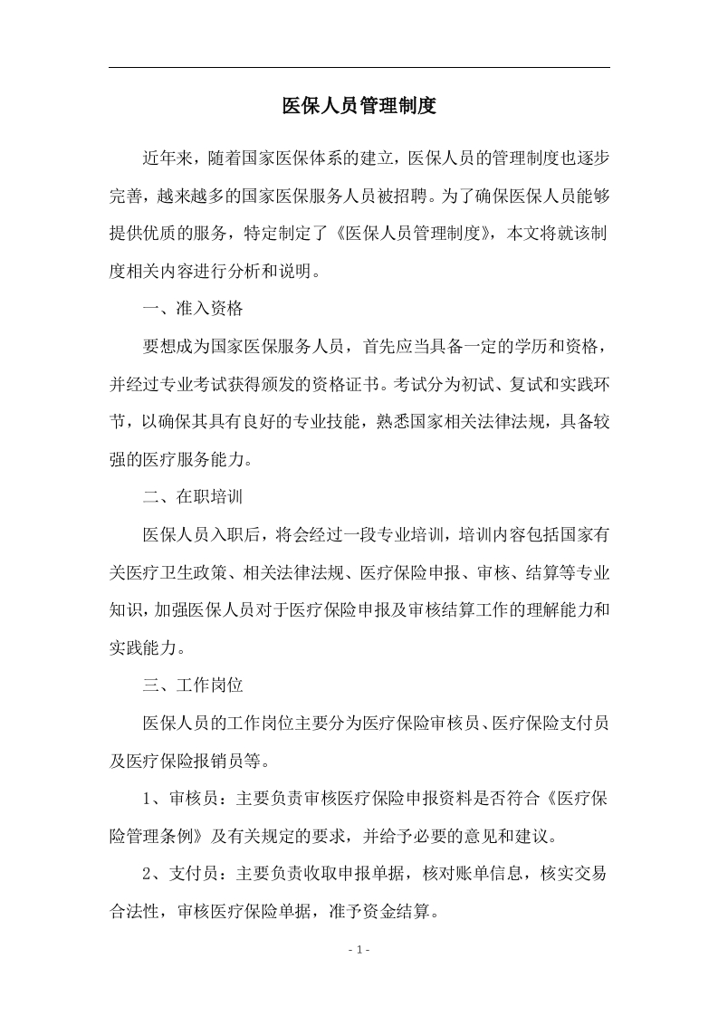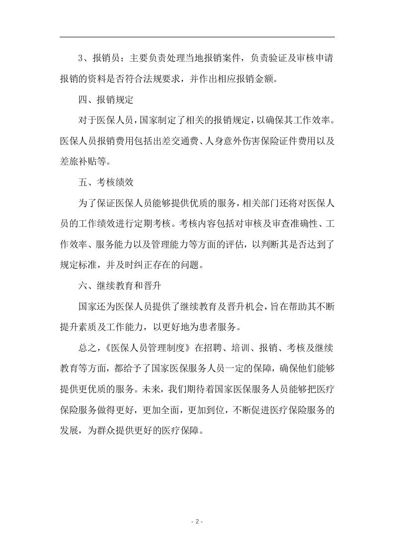 医保人员管理制度近年来,随着国家医保体系的建立,医保人员的管理制度也逐步完善,越来越多的国家医保服务人员被招聘。为了确保医保人员能够提供优质的服务,特定制定了《医保人员管理制度》,本文将就该制度相关内容进行分析和说明。一、准入资格要想成为国家医保服务人员,首先应当具备一定的学历和资格,并经过专业考试获得颁发的资格证书。考试分为初试、复试和实践环节,以确保其具有良好的专业技能,熟悉国家相关法律法规,具备较强的医疗服务能力。二、在职培训医保人员入职后,将会经过一段专业培训,培训内容包括国家有关医疗卫生政策、相关法律法规、医疗保险申报、审核、结算等专业知识,加强医保人员对于医疗保险申报及审核结算工作的理解能力和实践能力。三、工作岗位医保人员的工作岗位主要分为医疗保险审核员、医疗保险支付员及医疗保险报销员等。1、审核员:主要负责审核医疗保险申报资料是否符合《医疗保险管理条例》及有关规定的要求,并给予必要的意见和建议。2、支付员:主要负责收取申报单据,核对账单信息,核实交易合法性,审核医疗保险单据,准予资金结算。-1-
