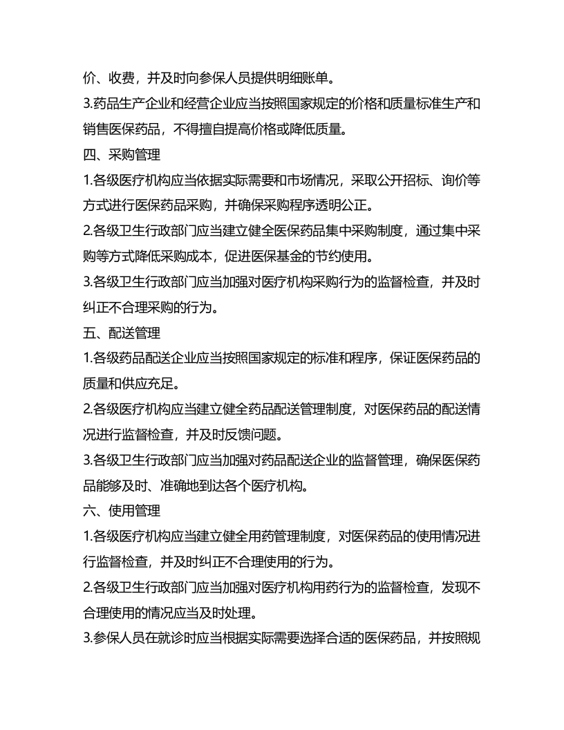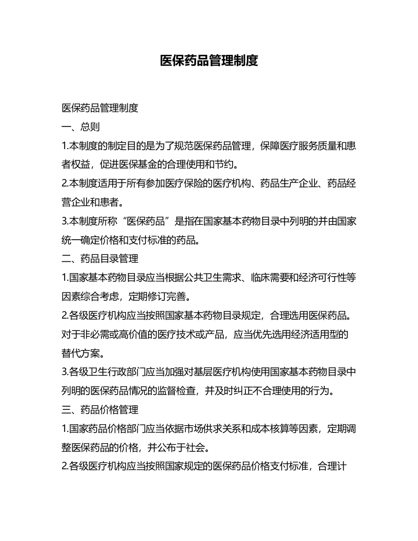 医保药品管理制度医保药品管理制度一、总则1.本制度的制定目的是为了规范医保药品管理,保障医疗服务质量和患者权益,促进医保基金的合理使用和节约。2本制度适用于所有参加医疗保险的医疗机构、药品生产企业、药品经营企业和患者。3.本制度所称“医保药品”是指在国家基本药物目录中列明的并由国家统一确定价格和支付标准的药品。二、药品目录管理1.国家基本药物目录应当根据公共卫生需求、临床需要和经济可行性等因素综合考虑,定期修订完善。2.各级医疗机构应当按照国家基本药物目录规定,合理选用医保药品。对于非必需或高价值的医疗技术或产品,应当优先选用经济适用型的替代方案。3.各级卫生行政部门应当加强对基层医疗机构使用国家基本药物目录中列明的医保药品情况的监督检查,并及时纠正不合理使用的行为。三、药品价格管理1.国家药品价格部门应当依据市场供求关系和成本核算等因素,定期调整医保药品的价格,并公布于社会。2.各级医疗机构应当按照国家规定的医保药品价格支付标准,合理计