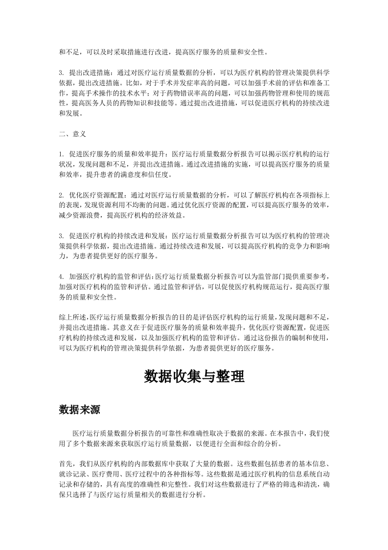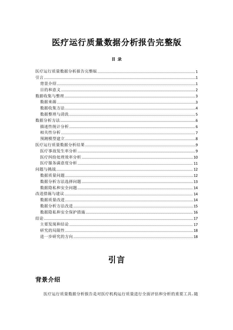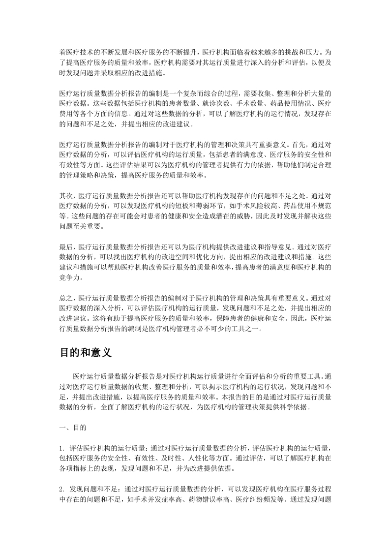 医疗运行质量数据分析报告完整版目录医疗运行质量数据分析报告完整版引言….1背景介绍.1目的和意义….2数据收集与整理.3数据米源…3数据收集方法.4数据整理与清洗5数据分析方法.6描述性统计分析.6相关性分析….7预测模型建立.8医疗运行质量数据分析结果9医疗事故发生率分析。.9医疗纠纷处理效率分析10医疗服务满意度分析11问题与挑战…12数据质量问题12数据分析方法选择问题13数据隐私和安全问题14改进措施与建议…14数据质量改进.14数据分析方法改进15数据隐私和安全保护措施16结论17主要发现和结论17研究的局限性.。18进一步研究的方向18引言背景介绍医疗运行质量数据分析报告是对医疗机构运行质量进行全面评估和分析的重要工具。随