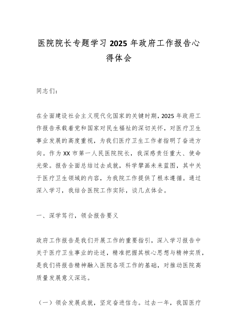 医院院长专题学习2025年政府工作报告心得体会同志们:在全面建设社会主义现代化国家的关键时期,2025年政府工作报告承载着党和国家对民生福祉的深切关怀,对医疗卫生事业发展的高度重视,为我们医疗卫生工作者指明了奋进方向。作为X市第一人民医院院长,我深感责任重大、使命光荣。报告全面总结过去成就,科学擘画未来蓝图,其中关于医疗卫生领域的内容,为我院工作提供了根本遵循。通过深入学习,我结合医院工作实际,谈几点体会。一、深学笃行,领会报告要义政府工作报告是我们开展工作的重要指引,深入学习报告中关于医疗卫生事业的论述,精准把握其核心思想与精神实质,是我们将报告精神融入医院各项工作的基础,对推动医院高质量发展意义深远。(一)领会发展成就,坚定奋进信念。过去一年,我国医疗