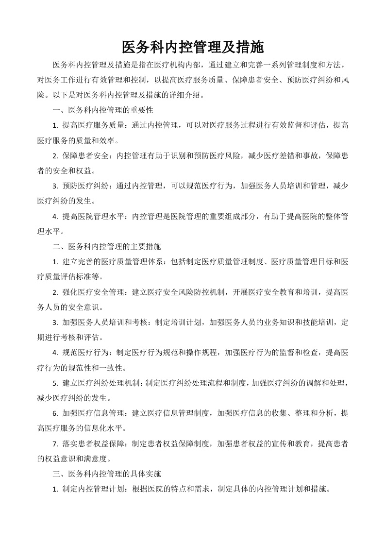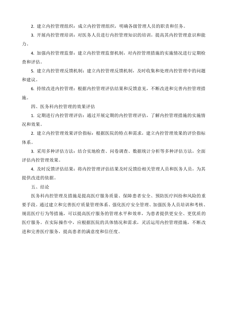 医务科内控管理及措施医务科内控管理及措施是指在医疗机构内部,通过建立和完善一系列管理制度和方法,对医务工作进行有效管理和控制,以提高医疗服务质量、保障患者安全、预防医疗纠纷和风险。以下是对医务科内控管理及措施的详细介绍。一、医务科内控管理的重要性1.提高医疗服务质量:通过内控管理,可以对医疗服务过程进行有效监督和评估,提高医疗服务的质量和效率。2.保障患者安全:内控管理有助于识别和预防医疗风险,减少医疗差错和事故,保障患者的安全和权益3.预防医疗纠纷:通过内控管理,可以规范医疗行为,加强医务人员培训和管理,减少医疗纠纷的发生。4.提高医院管理水平:内控管理是医院管理的重要组成部分,有助于提高医院的整体管理水平。二、医务科内控管理的主要措施1.建立完善的医疗质量管理体系:包括制定医疗质量管理制度、医疗质量管理目标和医疗质量评估标准等。2.强化医疗安全管理:建立医疗安全风险防控机制,开展医疗安全教育和培训,提高医务人员的安全意识。3.加强医务人员培训和考核:制定培训计划,加强医务人员的业务知识和技能培训,定期进行考核和评估。4.规范医疗行为:制定医疗行为规范和操作规程,加强医疗行为的监督和检查,提高医疗行为的规范性和一致性。5.建立医疗纠纷处理机制:制定医疗纠纷处理流程和制度,加强医疗纠纷的调解和处理,减少医疗纠纷的发生。6.加强医疗信息管理:建立医疗信息管理制度,加强医疗信息的收集、整理和分析,提高医疗服务的信息化水平。7.落实患者权益保障:制定患者权益保障制度,加强患者权益的宣传和教育,提高患者的权益意识和满意度。三、医务科内控管理的具体实施1.制定内控管理计划:根据医院的特点和需求,制定具体的内控管理计划和措施。