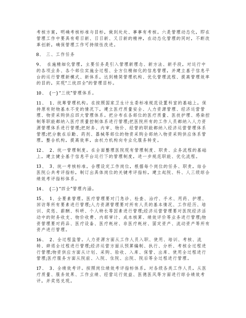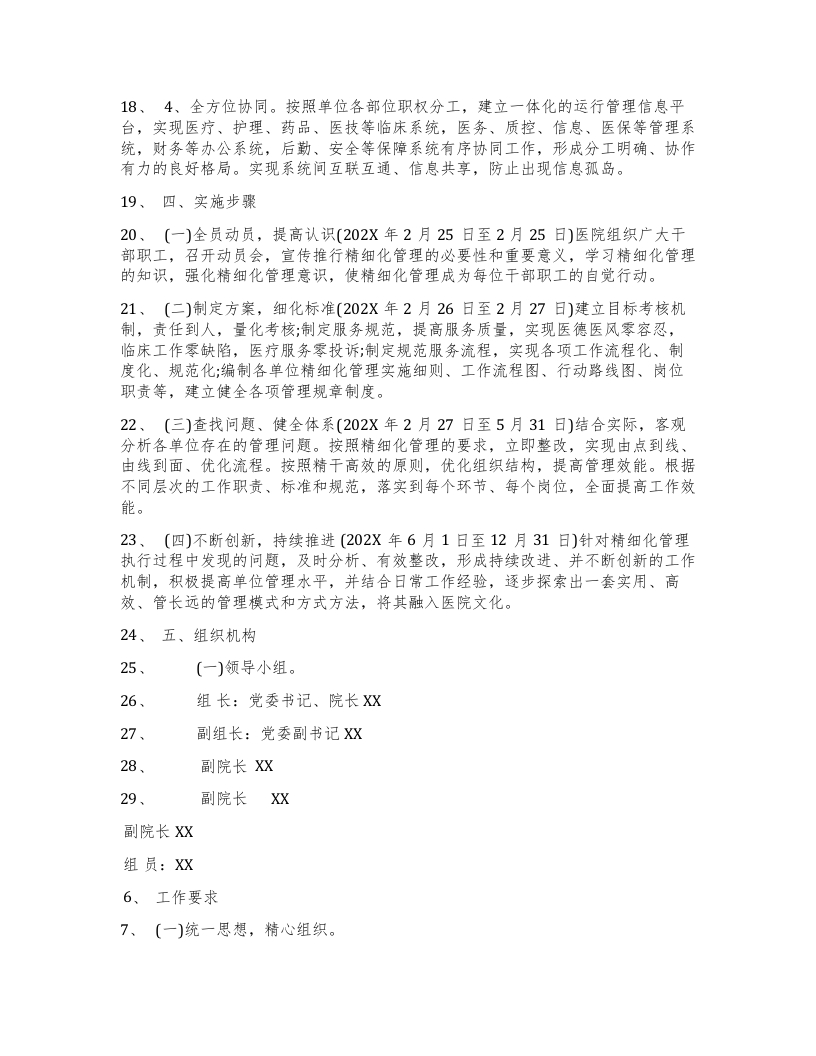 医院精细化管理方案计划实施组织XXX人民医院精细化管理实施方案为了进一步探索医院精细化管理的长效机制,不断强化医院管理水平,优化服务流程,提升医疗服务水平,根据有关要求,结合我院实际情况,制定本方案。1、指导思想2、以科学发展观为指导,以病人为中心,以提高医疗服务质量为主题,以巩固成果、深化管理、持续改进、不断创新、提高水平为原则,以“抓整改、抓争创、抓督导、抓落实”为手段,逐步健全医院管理长效机制,为人民群众提供安全、有效、方便、价廉的医疗服务。3、二、总体目标4、坚持以患者为中心,通过开展精细化管理工作,树立精细化的管理理念,营造精细化管理的文化氛围,将精细化管理方法运用到各项日常工作中,逐步建立科学、规范的精细化管理体系,全面提高医疗机构的管理和服务水平,实现“六精、六细、六化、”的总体目标。5、六精:一是打造一批医疗服务精品。二是医院成本核算精算。三是掌握运用信息化管理的精髓。四是培养一批医疗、管理人才精英。五是岗位职责定位精确。六是确保工作执行精准。6、六细:一是管理细,即在建立健全管理体系的基础上,将管理的触角伸向每一个角落,达到“处处有管理,事事见管理”的目标。二是制度细,即结合日常工作的实际情况,有针对性的制定管理制度,并确保制度执行的可操作性,逐步形成套完善、细化的制度体系。三是标准细,即要求工作中做到事事有标准,并按照标准要求坚决执行。四是服务细,即在工作中要注重细节,不断完善服务流程再造,提升服务能力和内涵。五是流程细,即对每一个流程细化时间安排、质量标准和前后衔接,制定出每个流程的服务标准,确保流程顺畅。六是奖罚细,即在工作中结合标准、制度的要求落实考核的同时,制定出详细的奖惩细则,做到奖罚可追溯,奖惩有依据。7、六化:一是管理科学化,彻底改变过去的经验管理模式,引入现代化的管理理念和方法,实现日常工作管理的规范化、科学化。二是服务人性化,通过优化服务流程,注重服务的细节管理,改进服务的方式方法,通过改善服务环境,提高患者就医感受满意度。三是运行信息化,精细化管理的核心是复杂的事情简单化、简单的事情流程化、流程化的事情定量化、定量化的事情信息化,因此,要不断提高信息化程度,提高工作的效率。四是质量标准化,即建立各项工作质量标准及质量管理体系,并严格落实质量控制。五是考核定量化,即结合实际,制定科学的绩效