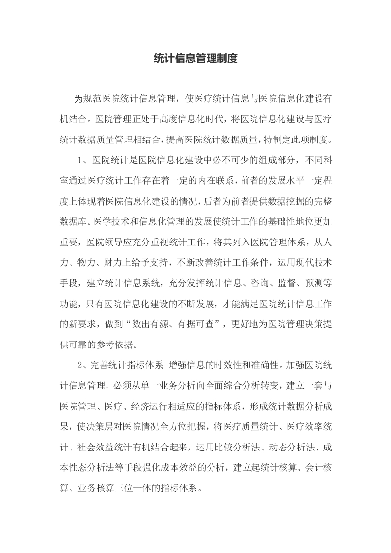 统计信息管理制度为规范医院统计信息管理,使医疗统计信息与医院信息化建设有机结合。医院管理正处于高度信息化时代,将医院信息化建设与医疗统计数据质量管理相结合,提高医院统计数据质量,特制定此项制度。1、医院统计是医院信息化建设中必不可少的组成部分,不同科室通过医疗统计工作存在着一定的内在联系,前者的发展水平一定程度上体现着医院信息化建设的情况,后者为前者提供数据挖掘的完整数据库。医学技术和信息化管理的发展使统计工作的基础性地位更加重要,医院领导应充分重视统计工作,将其列入医院管理体系,从人力、物力、财力上给予支持,不断改善统计工作条件,运用现代技术手段,建立统计信息系统,充分发挥统计信息、咨询、监督、预测等功能,只有医院信息化建设的不断发展,才能满足医院统计信息工作的新要求,做到“数出有源、有据可查”,更好地为医院管理决策提供可靠的参考依据。2、完善统计指标体系增强信息的时效性和准确性。加强医院统计信息管理,必须从单一业务分析向全面综合分析转变,建立一套与医院管理、医疗、经济运行相适应的指标体系,形成统计数据分析成果,使决策层对医院情况全方位把握,将医疗质量统计、医疗效率统计、社会效益统计有机结合起来,运用比较分析法、动态分析法、成本性态分析法等手段强化成本效益的分析,建立起统计核算、会计核算、业务核算三位一体的指标体系。