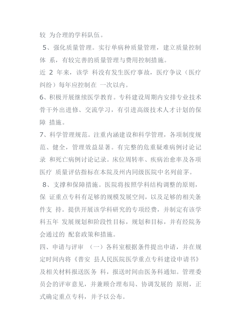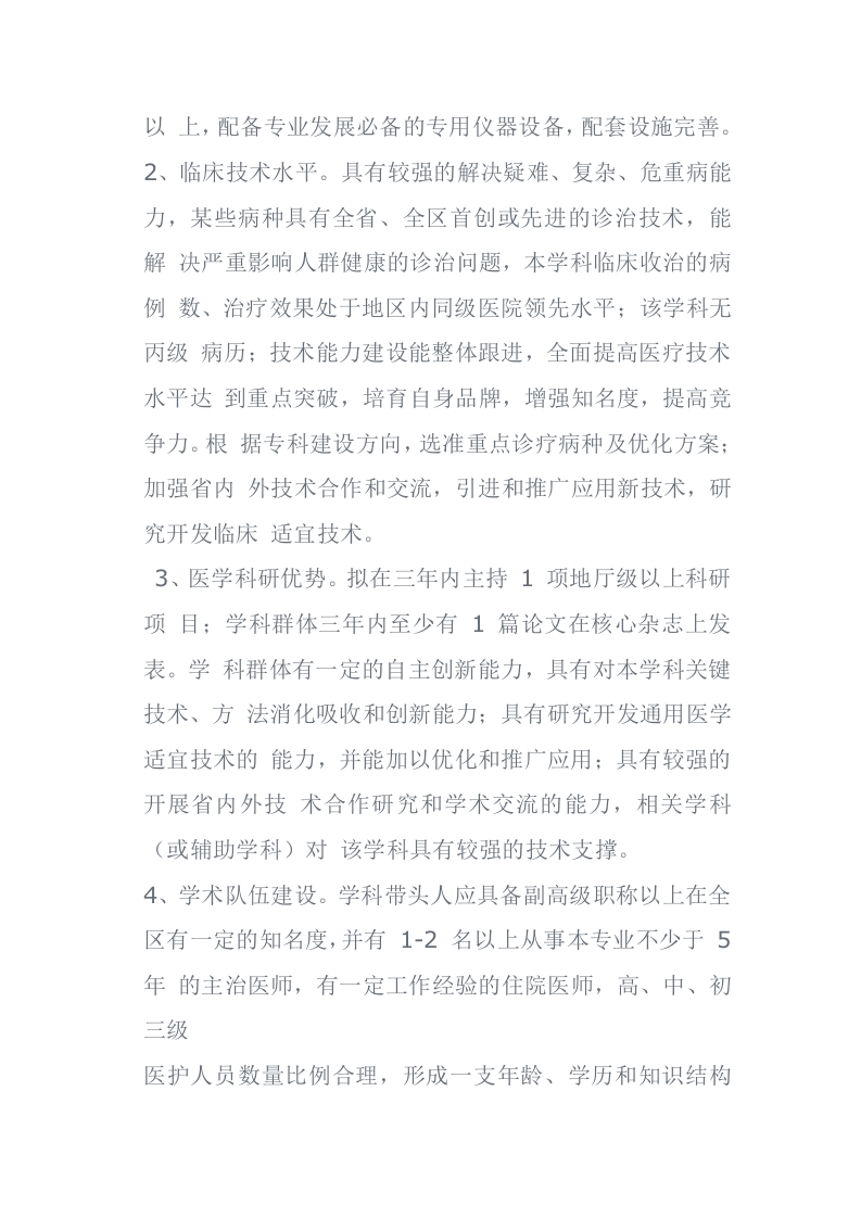 医院重点专科建设实施方案为深入贯彻落实科学发展观,全面实施“科教兴医”战略,促进医学科技进步,加快医学人才培养,提高我院医疗技术水平和综合竞争力,建设一批达到省内先进、地区内领先的医学重点专科,结合我院实际,特制定本方案。一、专科定位医学重点专科是已形成技术精湛,服务优良,设备完善,管理规范,具有相当规模的现代化医学专科。具备较强的解决本学科疑难、复杂和危重病症能力;具有对本学科关键技术和方法进行消化吸收和创新的能力;具有研究开发医学适宜技术的能力,并能加以优化和推广应用;具有较强的开展省内外技术合作研究和学术交流的能力。二、建设目标通过开展医学重点专科建设。努力形成医疗、科研、教学、管理密切结合并相互促进的学科建设良性运行机制。使我院医学科技的整体实力达到地区内同级医院的先进水平,带动全院医疗卫生技术水平的整体提高。三、申报条件医学重点专科的申报对象是我院突出的学科。医学重点专科研究领域和技术攻关方向应是地区疾病防治的普遍性问题或难点问题,具有较强技术创新能力,能站在地区医学科技的制高点,并符合以下条件:1、床位及基础设施。有足够的工作用房,科室15张床位