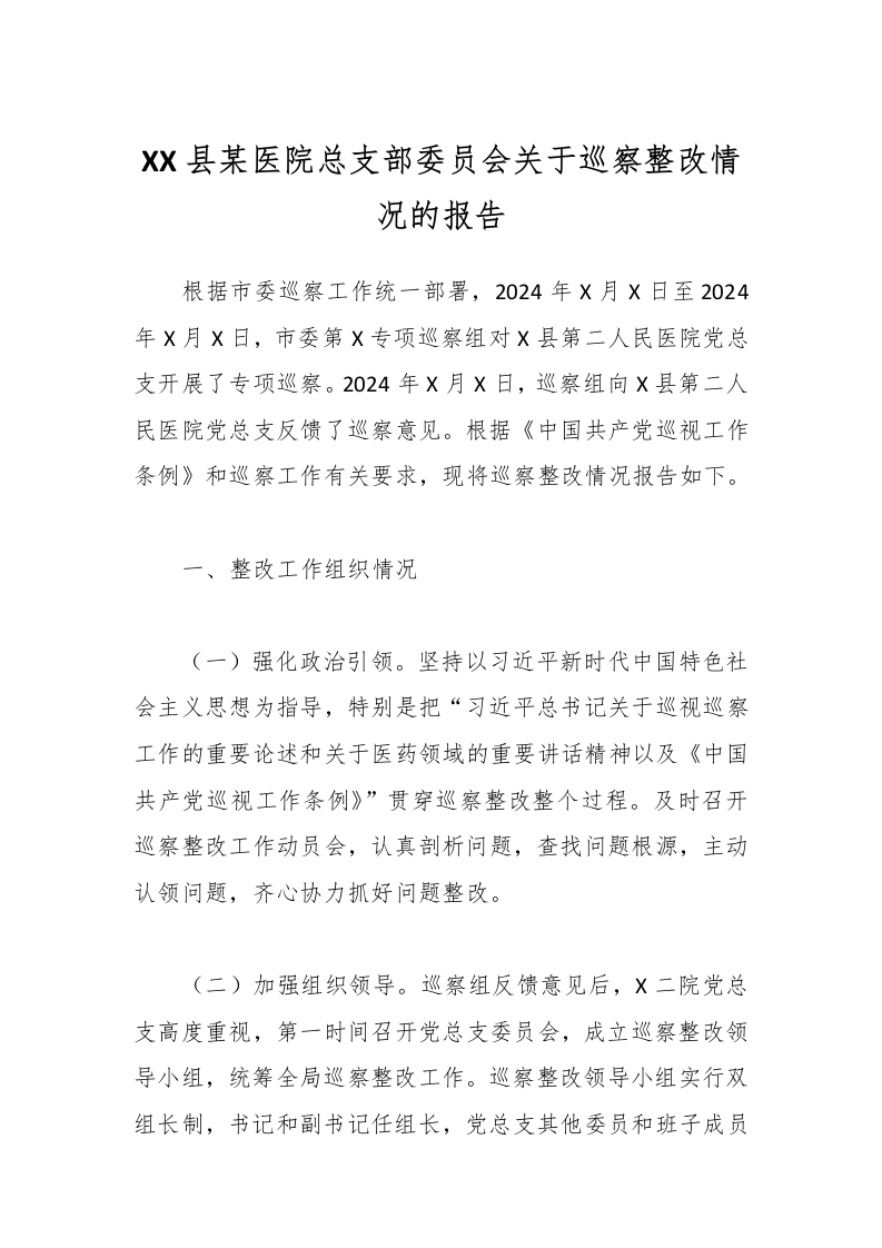 X县某医院总支部委员会关于巡察整改情况的报告根据市委巡察工作统一部署,2024年X月X日至2024年X月X日,市委第X专项巡察组对X县第二人民医院党总支开展了专项巡察。2024年X月X日,巡察组向X县第二人民医院党总支反馈了巡察意见。根据《中国共产党巡视工作条例》和巡察工作有关要求,现将巡察整改情况报告如下。一、整改工作组织情况(一)强化政治引领。坚持以习近平新时代中国特色社会主义思想为指导,特别是把“习近平总书记关于巡视巡察工作的重要论述和关于医药领域的重要讲话精神以及《中国共产党巡视工作条例》”贯穿巡察整改整个过程。及时召开巡察整改工作动员会,认真剖析问题,查找问题根源,主动认领问题,齐心协力抓好问题整改。(二)加强组织领导。巡察组反馈意见后,X二院党总支高度重视,第一时间召开党总支委员会,成立巡察整改领导小组,统筹全局巡察整改工作。巡察整改领导小组实行双组长制,书记和副书记任组长,党总支其他委员和班子成员