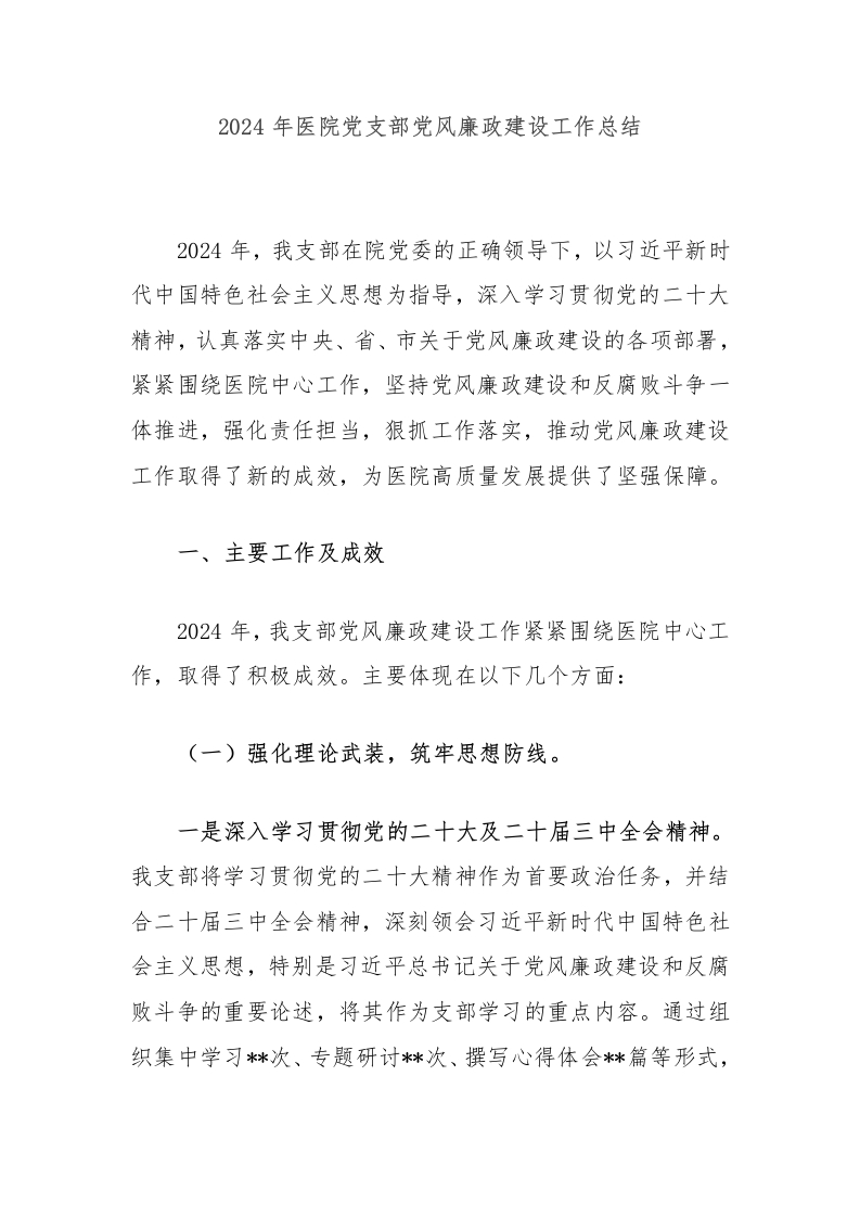 2024年医院党支部党风廉政建设工作总结2024年,我支部在院党委的正确领导下,以习近平新时代中国特色社会主义思想为指导,深入学习贯彻党的二十大精神,认真落实中央、省、市关于党风廉政建设的各项部署,紧紧围绕医院中心工作,坚持党风廉政建设和反腐败斗争一体推进,强化责任担当,狠抓工作落实,推动党风廉政建设工作取得了新的成效,为医院高质量发展提供了坚强保障。一、主要工作及成效2024年,我支部党风廉政建设工作紧紧围绕医院中心工作,取得了积极成效。主要体现在以下几个方面:(一)强化理论武装,筑牢思想防线。一是深入学习贯彻党的二十大及二十届三中全会精神。我支部将学习贯彻党的二十大精神作为首要政治任务,并结合二十届三中全会精神,深刻领会习近平新时代中国特色社会主义思想,特别是习近平总书记关于党风廉政建设和反腐败斗争的重要论述,将其作为支部学习的重点内容。通过组织集中学习**次、专题研讨*次、撰写心得体会*篇等形式,