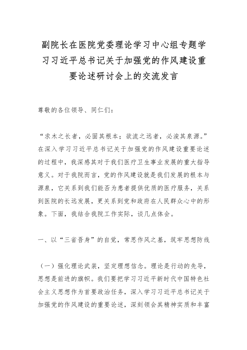 副院长在医院党委理论学习中心组专题学习习近平总书记关于加强党的作风建设重要论述研讨会上的交流发言尊敬的各位领导、同仁们:“求木之长者,必固其根本;欲流之远者,必浚其泉源。”在深入学习习近平总书记关于加强党的作风建设重要论述的过程中,我深感其对于我们医疗卫生事业发展的重大指导意义。对于我院而言,党的作风建设就是我们发展的根本与源泉,它关系到我们能否为患者提供优质的医疗服务,关系到医院的长远发展,更关系到党和政府在人民群众心中的形象。下面,我结合我院工作实际,谈几点体会。一、以“三省吾身”的自觉,常思作风之基,筑牢思想防线(一)强化理论武装,坚定理想信念。理论是行动的先导,思想是前进的旗帜。我们要把学习习近平新时代中国特色社会主义思想作为首要政治任务,深入学习习近平总书记关于加强党的作风建设的重要论述,深刻领会其精神实质和丰富