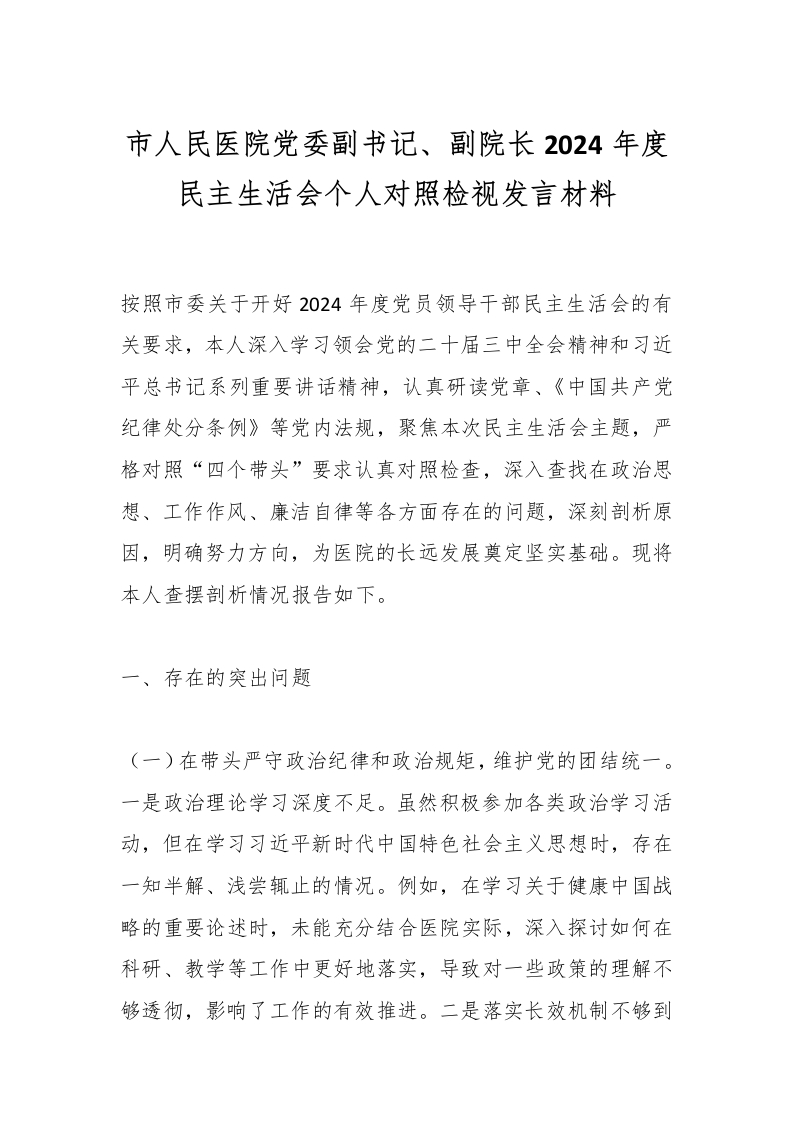 市人民医院党委副书记、副院长2024年度民主生活会个人对照检视发言材料按照市委关于开好2024年度党员领导干部民主生活会的有关要求,本人深入学习领会党的二十届三中全会精神和习近平总书记系列重要讲话精神,认真研读党章、《中国共产党纪律处分条例》等党内法规,聚焦本次民主生活会主题,严格对照“四个带头”要求认真对照检查,深入查找在政治思想、工作作风、廉洁自律等各方面存在的问题,深刻剖析原因,明确努力方向,为医院的长远发展奠定坚实基础。现将本人查摆剖析情况报告如下。一、存在的突出问题(一)在带头严守政治纪律和政治规矩,维护党的团结统一。一是政治理论学习深度不足。虽然积极参加各类政治学习活动,但在学习习近平新时代中国特色社会主义思想时,存在一知半解、浅尝辄止的情况。例如,在学习关于健康中国战略的重要论述时,未能充分结合医院实际,深入探讨如何在科研、教学等工作中更好地落实,导致对一些政策的理解不够透彻,影响了工作的有效推进。二是落实长效机制不够到