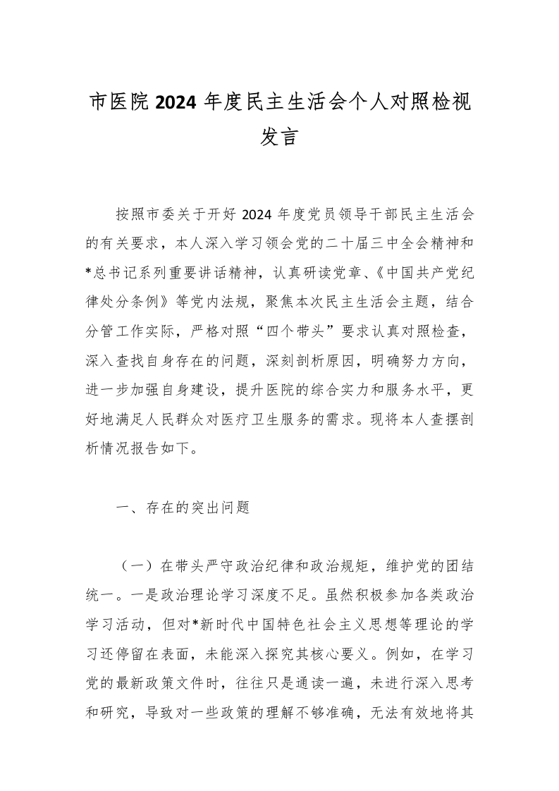 市医院2024年度民主生活会个人对照检视发言按照市委关于开好2024年度党员领导干部民主生活会的有关要求,本人深入学习领会党的二十届三中全会精神和*总书记系列重要讲话精神,认真研读党章、《中国共产党纪律处分条例》等党内法规,聚焦本次民主生活会主题,结合分管工作实际,严格对照“四个带头”要求认真对照检查,深入查找自身存在的问题,深刻剖析原因,明确努力方向,进一步加强自身建设,提升医院的综合实力和服务水平,更好地满足人民群众对医疗卫生服务的需求。现将本人查摆剖析情况报告如下。一、存在的突出问题(一)在带头严守政治纪律和政治规矩,维护党的团结统一。一是政治理论学习深度不足。虽然积极参加各类政治学习活动,但对*新时代中国特色社会主义思想等理论的学习还停留在表面,未能深入探究其核心要义。例如,在学习党的最新政策文件时,往往只是通读一遍,未进行深入思考和研究,导致对一些政策的理解不够准确,无法有效地将其