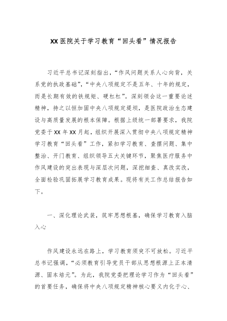 X医院关于学习教育“回头看”情况报告习近平总书记深刻指出,“作风问题关系人心向背,关系党的执政基础”,“中央八项规定不是五年、十年的规定,而是长期有效的铁规矩、硬杠杠”。深刻领会这一重要论述精神,持之以恒加固中央八项规定堤坝,是医院政治生态建设与高质量发展的根本保障。根据上级统一部署要求,我院党委于X年X月起,组织开展深入贯彻中央八项规定精神学习教育“回头看”工作,紧扣学习教育、查摆问题、集中整治、开门教育、组织领导五大关键环节,聚焦医疗服务中作风建设的突出表现与深层次问题,深挖细查、真改实改,全面检验巩固拓展学习教育成果。现将有关工作总结报告如下。一、深化理论武装,筑牢思想根基,确保学习教育入脑入心作风建设永远在路上,学习教育须臾不可放松。习近平总书记强调,“必须教育引导党员干部从思想根源上正本清源、固本培元”。为此,我院党委把理论学习作为“回头看”的首要任务,确保将中央八项规定精神核心要义内化于心、