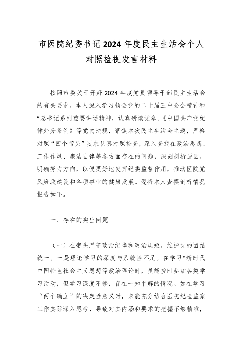 市医院纪委书记2024年度民主生活会个人对照检视发言材料按照市委关于开好2024年度党员领导干部民主生活会的有关要求,本人深入学习领会党的二十届三中全会精神和*总书记系列重要讲话精神,认真研读党章、《中国共产党纪律处分条例》等党内法规,聚焦本次民主生活会主题,严格对照“四个带头”要求认真对照检查,深入查找在政治思想、工作作风、廉洁自律等各方面存在的问题,深刻剖析原因,明确努力方向,以便更好地发挥纪委监督作用,推动医院党风廉政建设和各项事业的健康发展。现将本人查摆剖析情况报告如下。一、存在的突出问题(一)在带头严守政治纪律和政治规矩,维护党的团结统一。一是理论学习的深度与系统性不足。在学习*新时代中国特色社会主义思想等政治理论时,虽能按时参加各类学习活动,但学习深度不够,存在一知半解的情况。如在学习“两个确立”的决定性意义时,未能充分结合医院纪检监察工作实际深入思考,导致对其内涵和要求的把握不够精准,