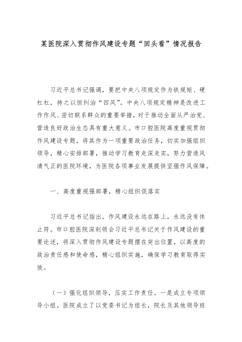 某医院深入贯彻作风建设专题“回头看”情况报告习近平总书记强调,要把中央八项规定作为铁规矩、硬杠杠,持之以恒纠治“四风”。中央八项规定精神是改进工作作风、密切联系群众的重要举措,对于推动全面从严治党、营造良好政治生态具有重大意义。市口腔医院高度重视贯彻作风建设专题,将其作为一项重要政治任务,切实加强组织领导,精心安排部署,推动学习教育走深走实,努力营造风清气正的医院环境,为医院各项事业发展提供坚强作风保障。一、高度重视强部署,精心组织促落实习近平总书记指出,作风建设永远在路上,永远没有休止符。市口腔医院深刻领会习近平总书记关于作风建设的重要论述,将深入贯彻作风建设专题摆在突出位置,以高度的政治责任感和使命感,精心组织实施,确保学习教育取得实效。(一)强化组织领导,压实工作责任。一是成立专项领导小组。医院成立了以党委书记为组长,院长及其他领导班