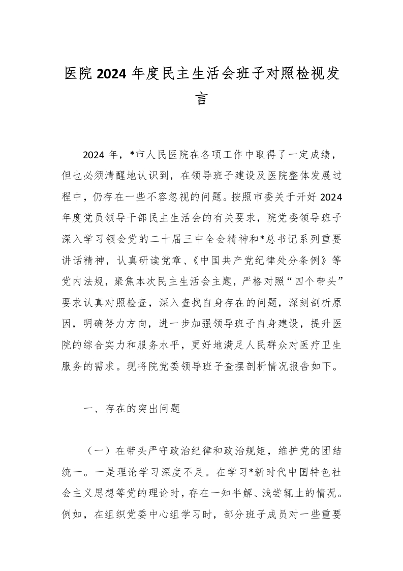 医院2024年度民主生活会班子对照检视发言2024年,*市人民医院在各项工作中取得了一定成绩,但也必须清醒地认识到,在领导班子建设及医院整体发展过程中,仍存在一些不容忽视的问题。按照市委关于开好2024年度党员领导干部民主生活会的有关要求,院党委领导班子深入学习领会党的二十届三中全会精神和*总书记系列重要讲话精神,认真研读党章、《中国共产党纪律处分条例》等党内法规,聚焦本次民主生活会主题,严格对照“四个带头”要求认真对照检查,深入查找自身存在的问题,深刻剖析原因,明确努力方向,进一步加强领导班子自身建设,提升医院的综合实力和服务水平,更好地满足人民群众对医疗卫生服务的需求。现将院党委领导班子查摆剖析情况报告如下。一、存在的突出问题(一)在带头严守政治纪律和政治规矩,维护党的团结统一。一是理论学习深度不足。在学习*新时代中国特色社会主义思想等党的理论时,存在一知半解、浅尝辄止的情况。例如,在组织党委中心组学习时,部分班子成员对一些重要